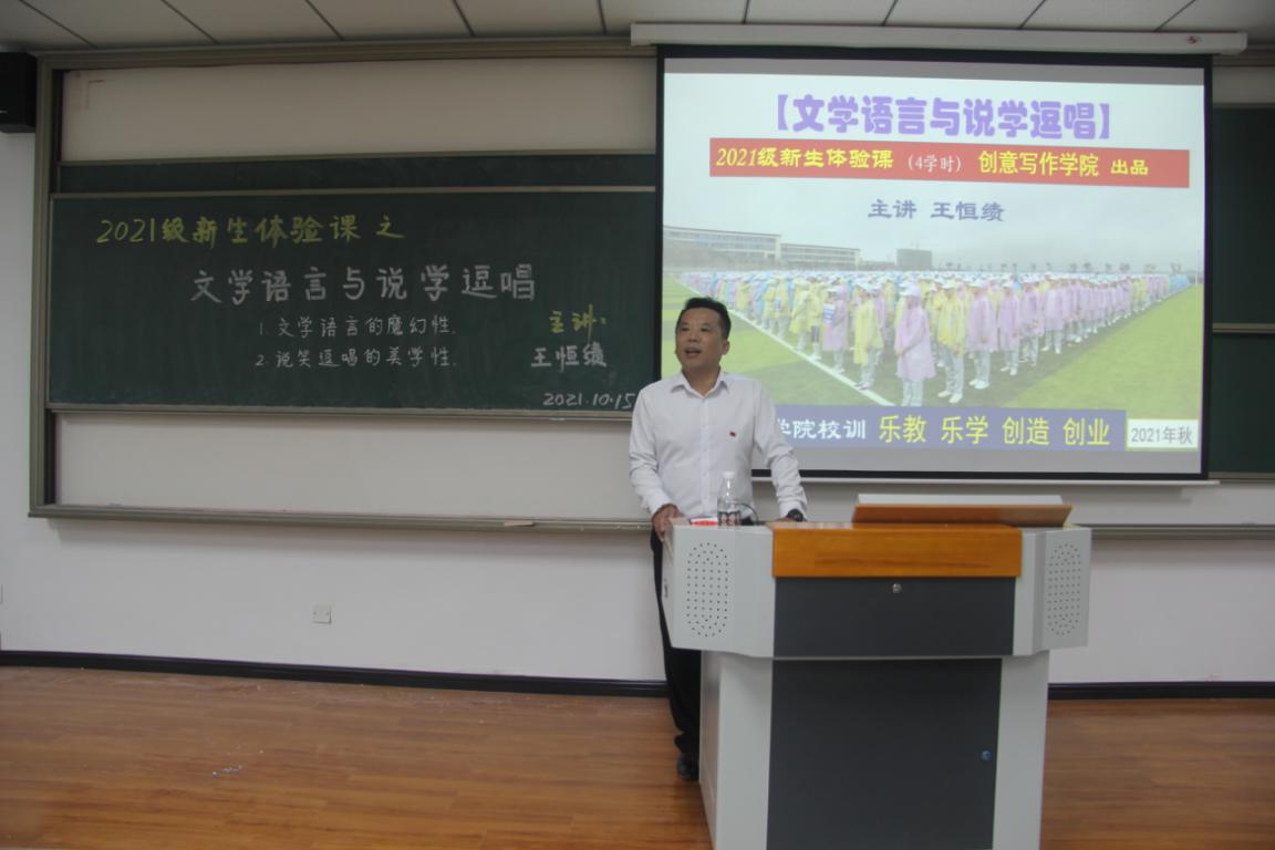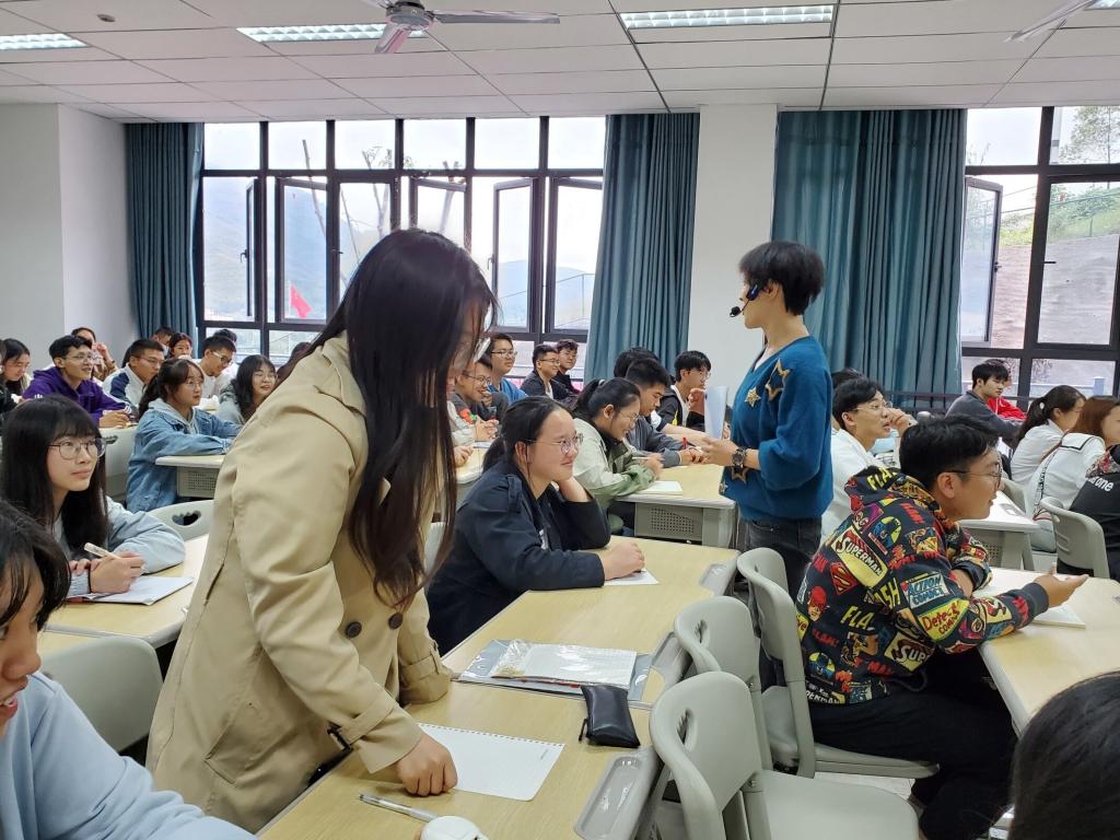 仁者楼305教室座无虚席。王恒绩老师用情景教学法辅以多种教学手段给同学们阐释“文学语言的魔幻性”和“说学逗唱的美学性”。