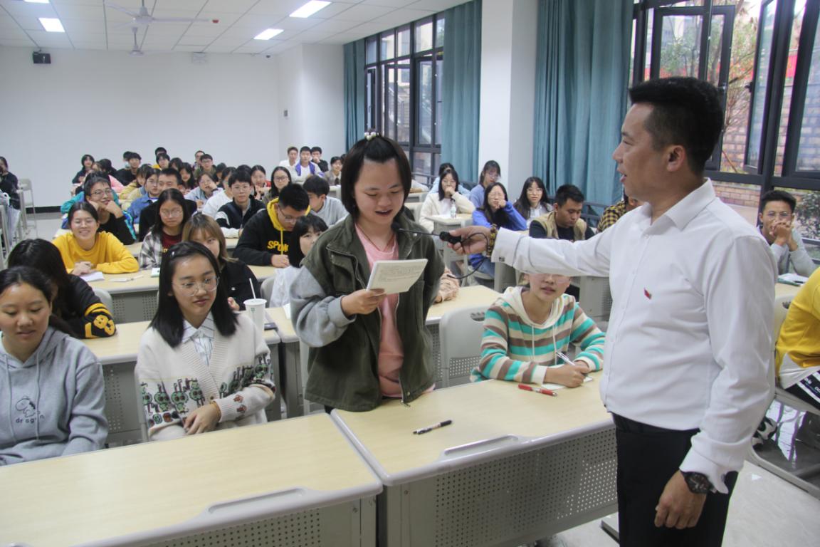 “我很自豪我们重庆移通学院有那么多好老师,王恒绩老师用炸裂的表演和风趣的讲课方式向我们巧妙地展现了文学语言与说学逗唱的隐秘联系,为我们带来了一场精神盛宴。”工商管理15班的张曼同学如是说。