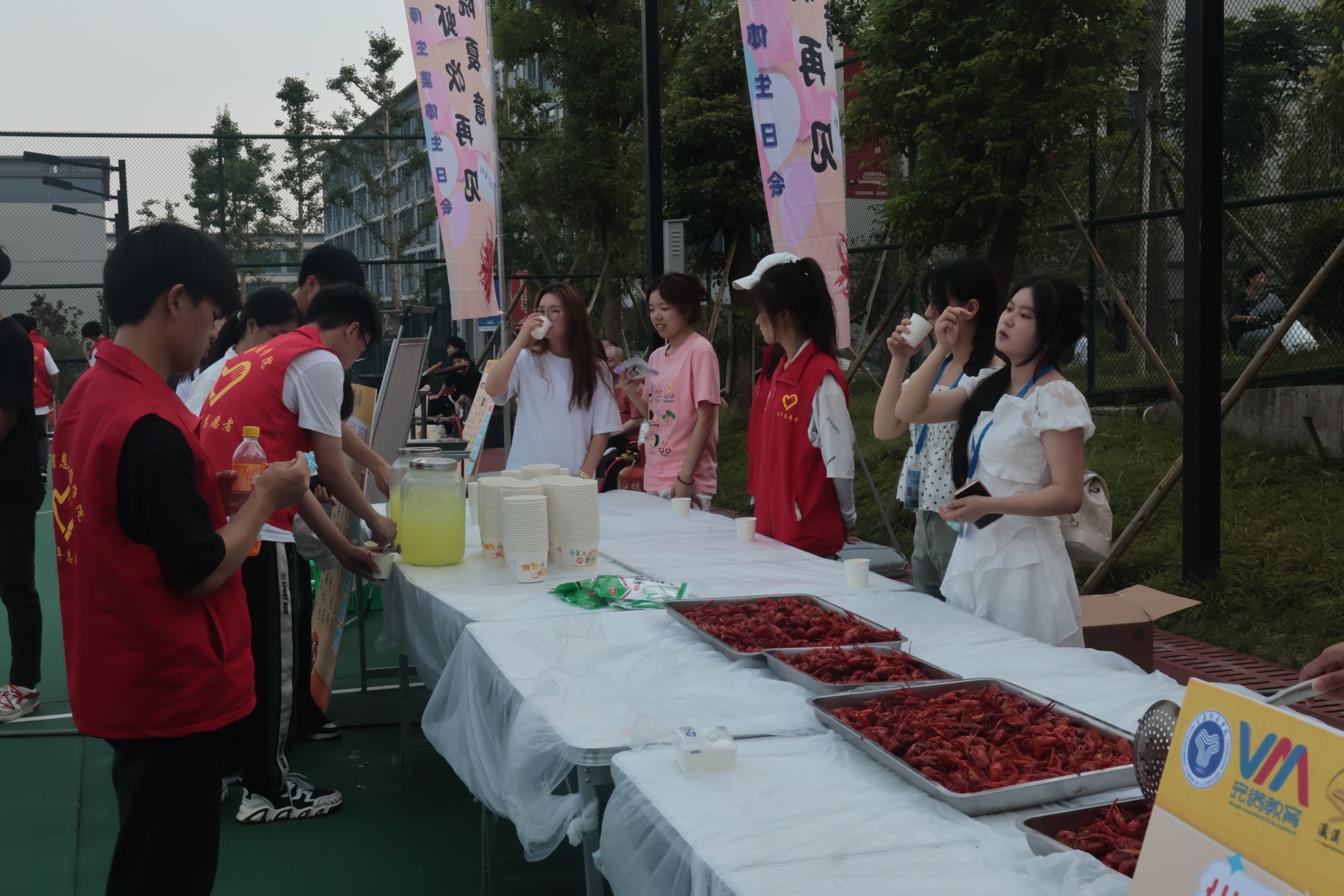 除了生日仪式和有趣的泼水祝福之外,还为即将学子们特别准备了热辣滚烫的麻辣小龙虾。在北方,虾被誉为“龙”,是吉祥之物,寓意吉祥平安。小龙虾坚硬的外壳,象征着顽强的生命力和敢于追求腾飞的精神;在一些文化中,人们聚在一起享用小龙虾被视为象征着团结与共享的精神。在场的学子们在一锅锅香气四溢的小龙虾前排起长龙,每份送出的小龙虾,也是对离院学子的火红祝愿。祝愿学子节节高升,收获好运与繁荣。