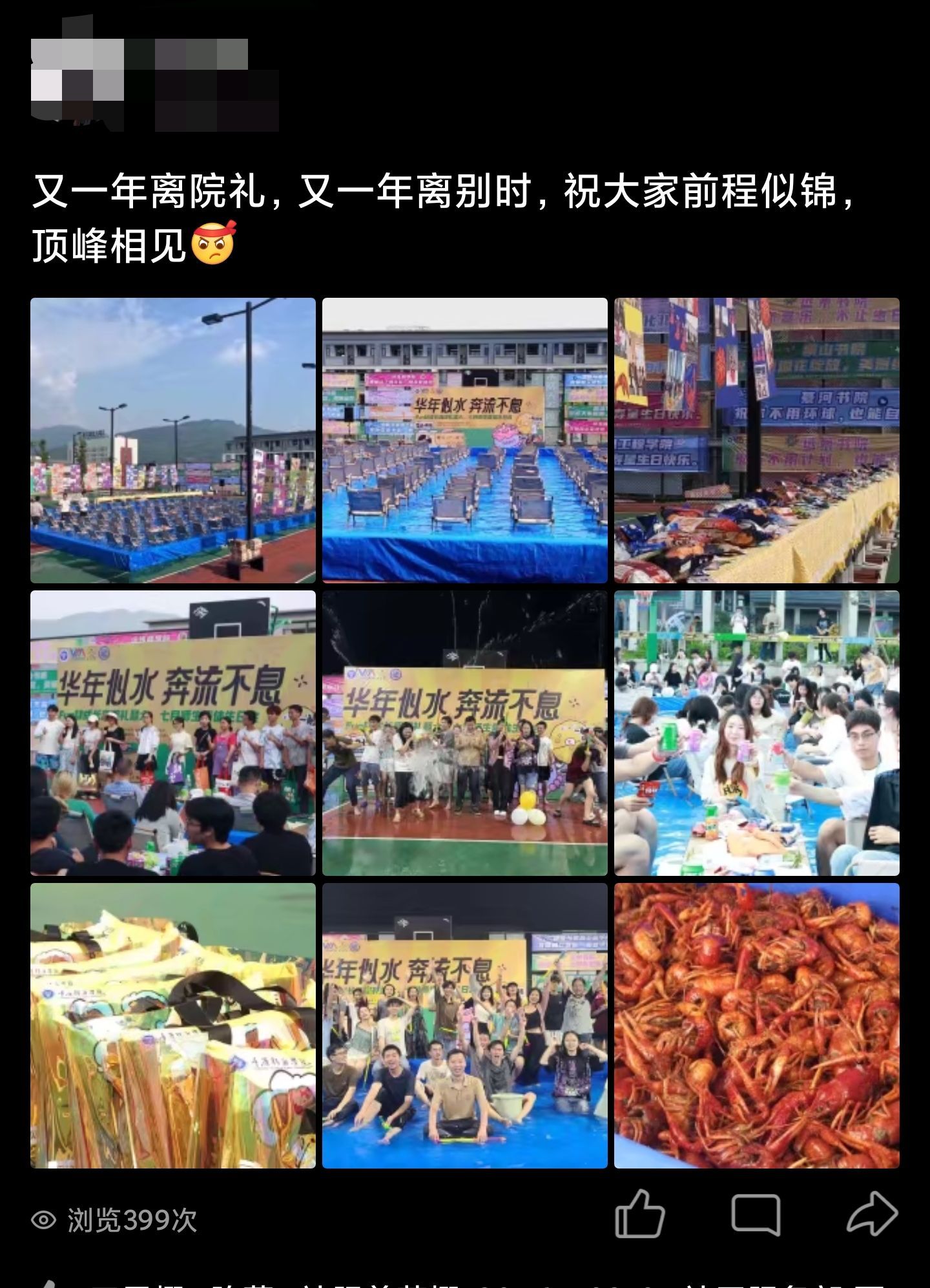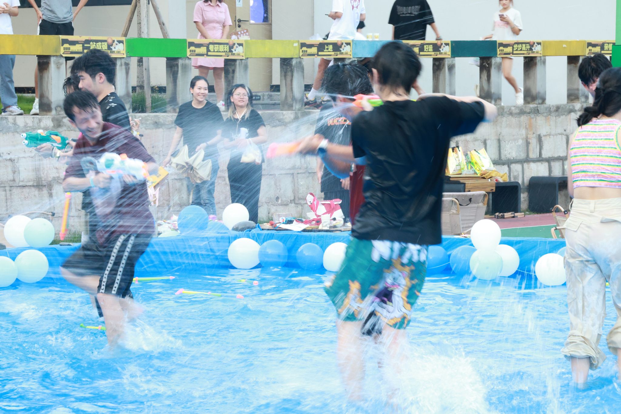 除了浓浓的仪式感,本次离院礼暨生日会,还是一场水上party。同学们在蓝色的水池中,追逐嬉戏,尽情释放。借着离别的情感,用泼水祝福的形式,表示着对好友、恩师的不舍。或许下次见是很多年后,或许未来的道路不会有交集,但此刻我们真挚地祝福着彼此,享受着快乐的一刻,并约定顶峰见。师生彼此祝福着,笑声郎朗,尽情挥洒。