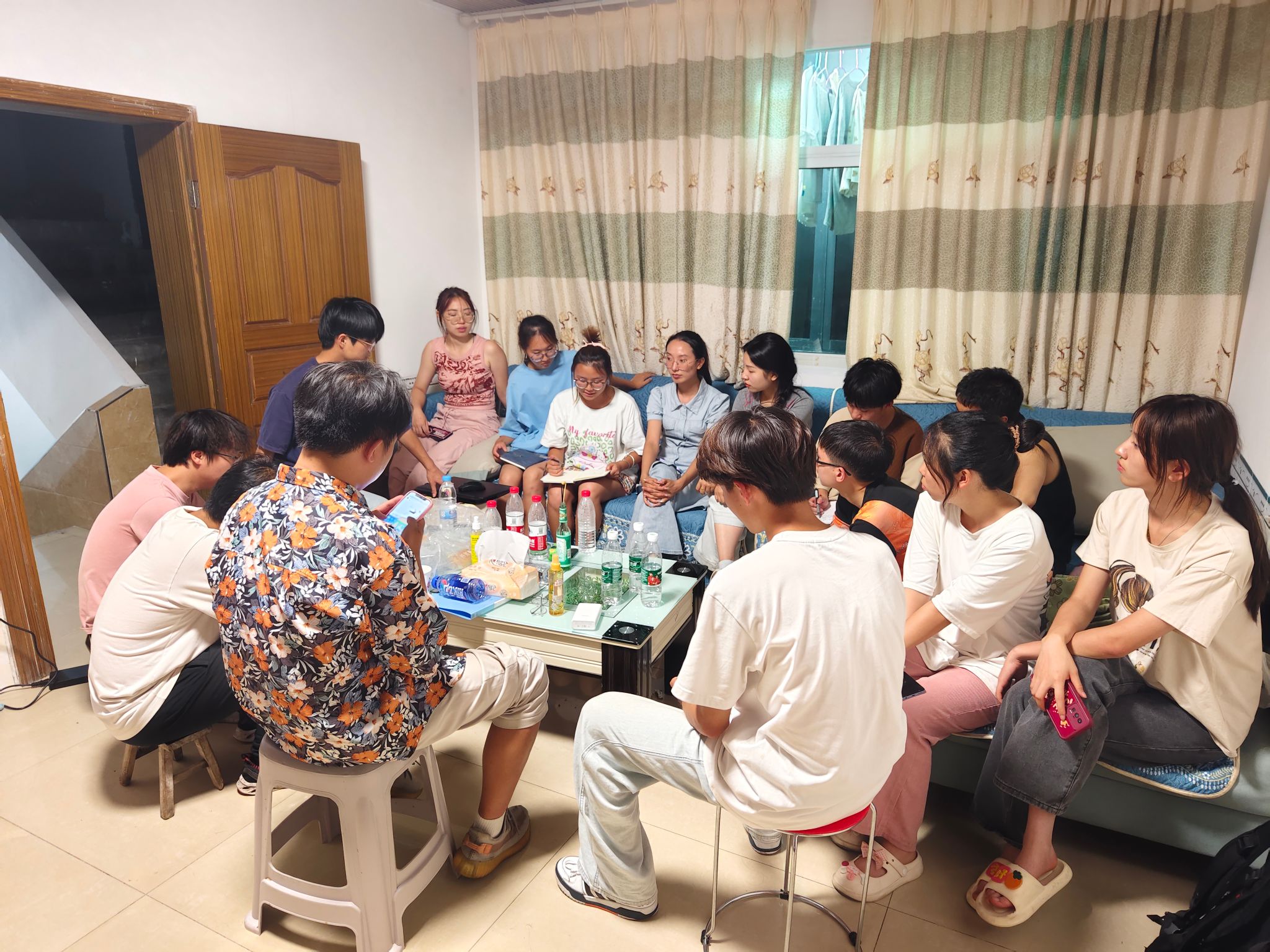 每天的晚上八点,队员们都会对剧本进行修整改编,在实地探访调研后,结合村民对红色革命精神的理解,同时队员们拜访了王先金先生,对当时的情景有了更加深入的了解。会议室里,大家互相倾听,互相尊重,共同打磨剧本。在有限的时间内,队员们一遍遍的排练,需要熟悉台词,经历脱稿,扣排演细节,加上肢体动作和情感,为第二天的舞台演出做好充足的准备。此剧本分为四幕剧情演示,当时信息闭塞,国民党反动派对老百姓传播红军杀人放火的谣言,在这个时代背景下,创造出来第一幕的剧情是土豪劣绅听到红军到来慌乱恐惧的情景。