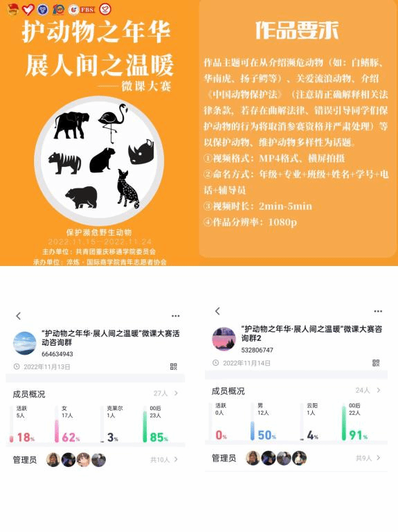 由于环境污染、动物栖息地减少、人类捕猎等原因,许多动物正面临着种种生存威胁,同时,在近几年的媒体报道中,关于虐待动物的新闻更是层出不穷。从中,不难看出在当今的社会中仍然存在一部分人保护动物的意识淡薄。为此,淬炼·国际商学院青年志愿者协会认真贯彻习近平总书记在二十大会议中提出的推动绿色发展、促进人与自然和谐共生的发展理念,于2022年11月15日开展以“护动物之年华·展人间之温暖”为主题的保护动物微课大赛。以此来提高移通学子保护动物意识,促进人与自然和谐发展,让青年力量在实践中,绽放绚丽之花。