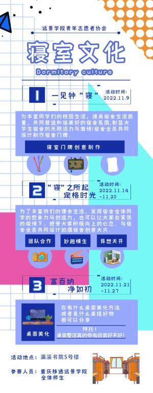 每个寝室都是一个艺术品,蕴藏着这个宿舍里每位同学的才华,如何才能将这份才华,这份才华要展现给大家,让大家知道,宿舍是我们共同的家?在这迷茫的大学生活中,我们都需要一份支持自己的信念,那么,就把这份信念形象化出来,拍摄成寝室创意大片,分享给广大同学,将信念种进心里,我们一起秀出来!为此,我院青年志愿者协会策划了这次活动,活动时间从2022年11月14日开始,截止到2022年11月20日;本次活动旨在让同学们发挥自己的想象力与创造力,驱散疫情下的阴霾,感受到大家积极向上的心态。参与的同学也是收获满满,获得了不少的乐趣。