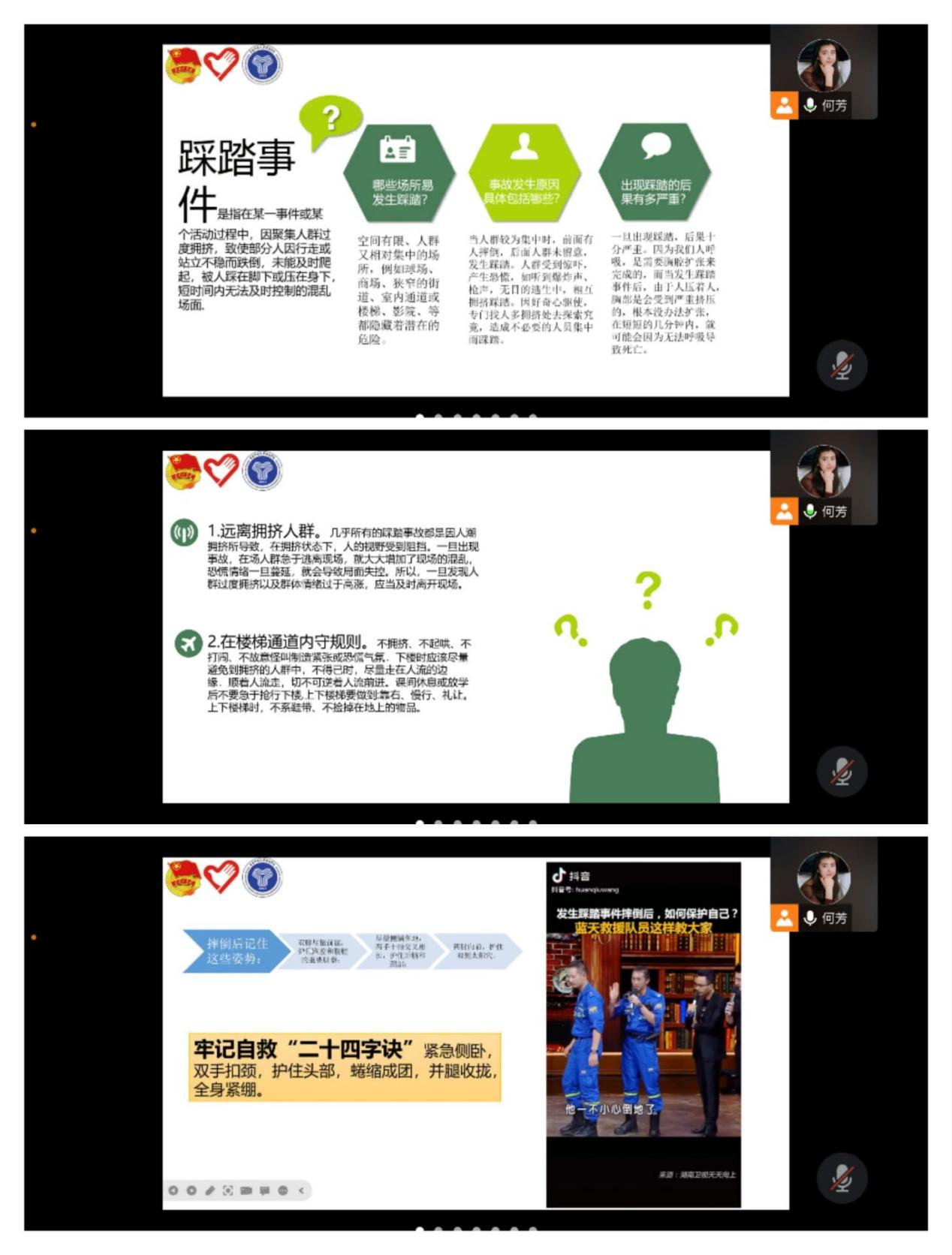 韩国梨泰院发生的严重踩踏事故令人倍感痛心,也再次敲响了警钟,即使身处校园,我校学生也应牢记“事故出于麻痹、安全来自警惕”。为进一步贯彻“预防为主防控结合”的方针,增强同学们的安全防范意识,提高全体同学的防止踩踏事件发生的能力,2022年11月12日我校大健康管理学院青年志愿者协会以线上形式举办了“‘不追不闹,不急不躁’预防校园踩踏志愿宣讲会”,此次防踩踏安全活动的开展旨在提升同学们的安全意识,为营造安全和谐的校园环境提供保障。