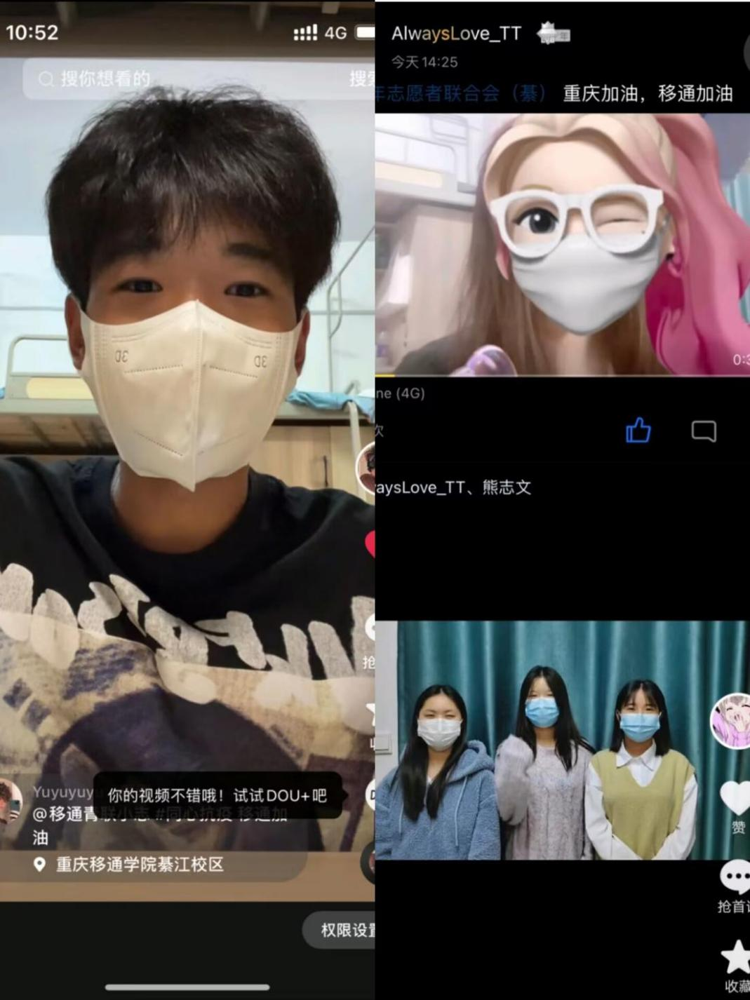 从“志愿红”到“防护蓝”再到“战疫白”,点点星光汇成星河,他们“疫”无反顾,奋楫笃行,优先保障学生,勇敢逆行。由青年志愿者联合会整体统筹在双校区开展“同心战‘疫’·移通加油”爱心短视频接力活动,綦江校区收到有效视频21份,同学们以短视频的形式通过镜头表达自己,感谢志愿者老师队伍的辛苦付出,为奋战在抗击疫情一线的人加油打气,一起加油共同战胜疫情。