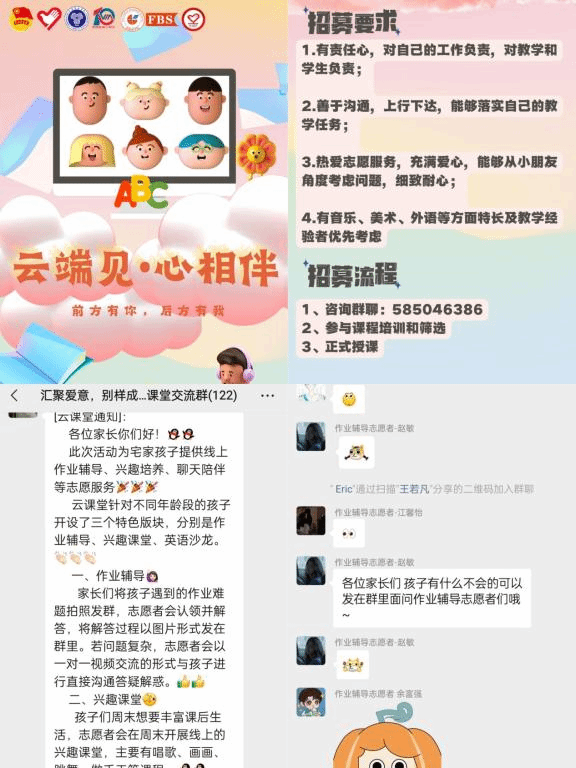 共赴难关,志愿陪伴,爱在行动。淬炼·国际商学院青年志愿者协会携手“七彩筑梦,完满绽放”关爱儿童志愿服务专项支队、童“yi”小课堂志愿服务专项支队结合实际情况动员全校同学于2022年11月15日开展“暖心陪伴·静等花开”云课堂辅导活动。课程以线上辅导为路径,围绕作业辅导、趣味英语、兴趣爱好三种类型课程开展。在校园疫情防控中,我们每个人都是志愿者,行动者。静默中爱在行动,我们定将携手并进,赢得属于我们的胜利。以感恩之心,青年之力,汇心聚力,为教职员工的孩子们的学习助力,为抗“疫”后方保驾护航。