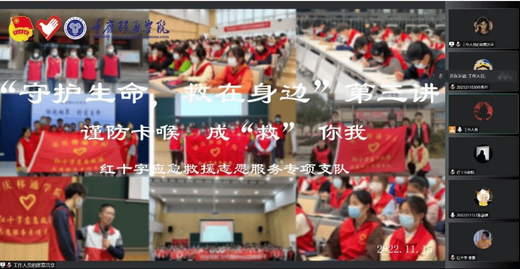 在生活平静惬意的今天,我们时常会听闻一些让人揪心的事故报道,而近些年来,因窒息引起的一系列祸难频频发生,面对突如其来的紧急情况,我们应当具备足够的知识和能力去应对它们,去保障自身与他人的生命安全,而海姆立克法,就是能让我们应对突发的卡喉事件,使受难者在短时间内得到有效的救助。为了让更多的人了解并学习海姆利克法,红十字应急救援志愿服务专项支队在遵守疫情防控的同时,于2022年11月16日下午16:00通过线上公开课的方式开展“守护生命,救在身边”第三讲——海姆利克法专题活动。其中线上参与人数150人。