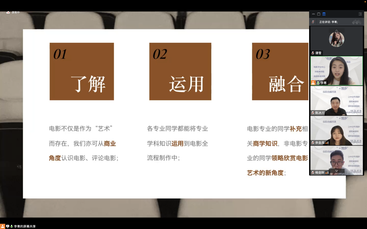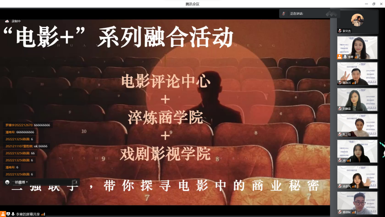 为深入贯彻执行重庆移通学院“四位一体”的教育方针,将专业教育、商科教育、通识教育、完满教育紧密结合,以及在培养数字经济时代高情商经营管理者的办学宗旨的指导下,电影评论中心、淬炼商学院、戏剧影视学院于2022年11月16日晚7点在腾讯会议上共同开展了“电影+”系列融合活动,从商科的思维认识电影,探寻“电影的商业秘密”。