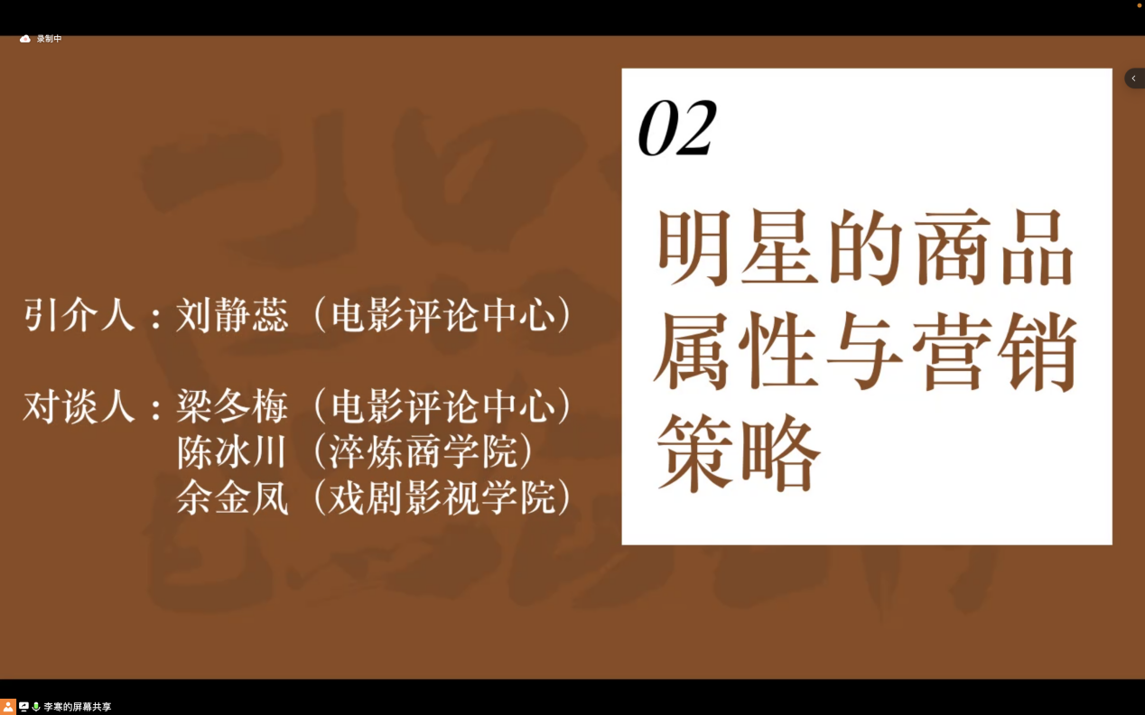 在第二个主题中,电影评论中心的刘静蕊老师首先介绍了这个板块的会谈老师,其次刘老师以明星的个例对所探讨的话题做出了简单的分析,叙述了明星效应给电影带来巨大票房红利的行业现象,从而引出了本板块在对谈环节将会涉及到的核心内容——明星的票房号召力与商业价值。