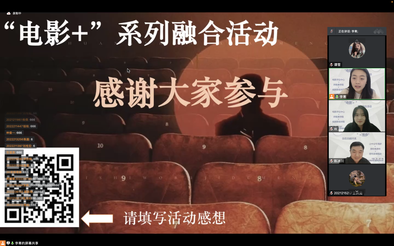 本次活动在合川、綦江双校区,以及各个学院、书院的大力支持下,共有300余位同学在16号的夜晚汇集在线上与老师们展开了积极的讨论,活动获得了圆满的成功。这样的一个跨专业的创新性融合交流活动,给同学们提供了不同的角度、不同的思路来看待中国电影的发展,更激发了学生的思辨能力。电影评论中心也将在学校倡导复合型人才的培养基调下大力的融合专业教育、商科教育和通识教育,在未来探索创新多样的融合活动,实现对人才的多元化培养。
