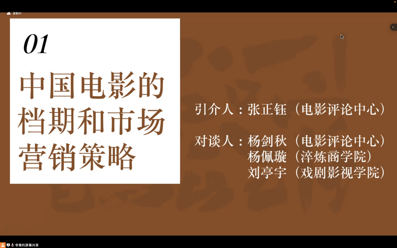 在第一个主题中,电影评论中心的张正钰老师作为这个板块的引介人,首先以具体的行业数据报告介绍了中国的各个档期的票房情况,特别是以国庆档、春节档的影片来分析了这两个档期的特色。随后,电影评论中心的杨剑秋老师以电影艺术、电影商业、电影的发行与放映的三角关系,与淬炼商学院的杨佩璇老师、戏剧影视学院的刘亭宇老师展开了对谈,对谈的内容聚焦到了电影档期的形成、档期的重要性、档期对电影创作的影响作用、国庆档与春节档未来的发展趋势、中国电影的生存路径等话题。