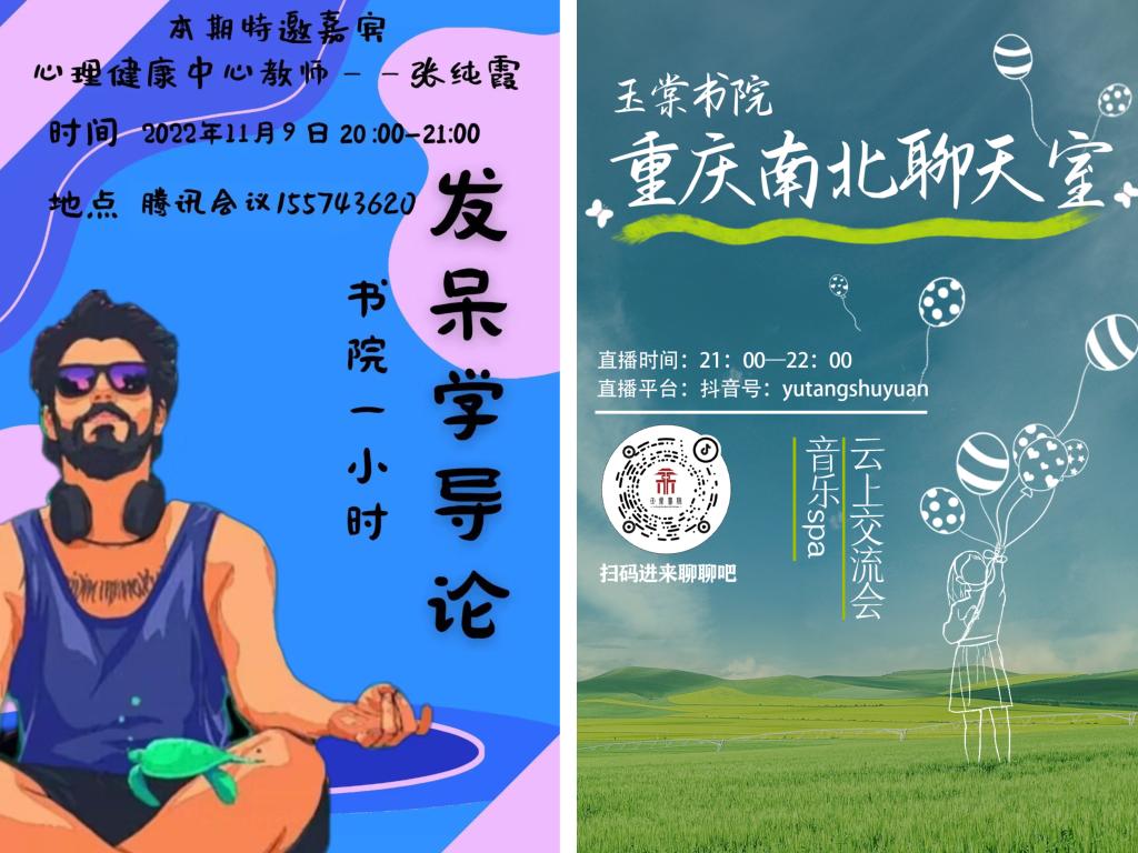 11月8日,我校在疫情防控小组和相关专家的指导下,合川校区进入临时管控阶段,为搭建温馨和谐、共享互助的朋辈交流平台,促进双校区书院学子友好交流,玉棠书院因时因需而应,以心理健康、社区生活、朋辈交流等方面为核心,以云端协同、校区共享为抓手,于11月9日推出“云端闲聊会”、“发呆学导论”、“舍友露一手”等活动,为合川校区学子在居寝健康管理期间的社区生活提供更为丰富的选择。