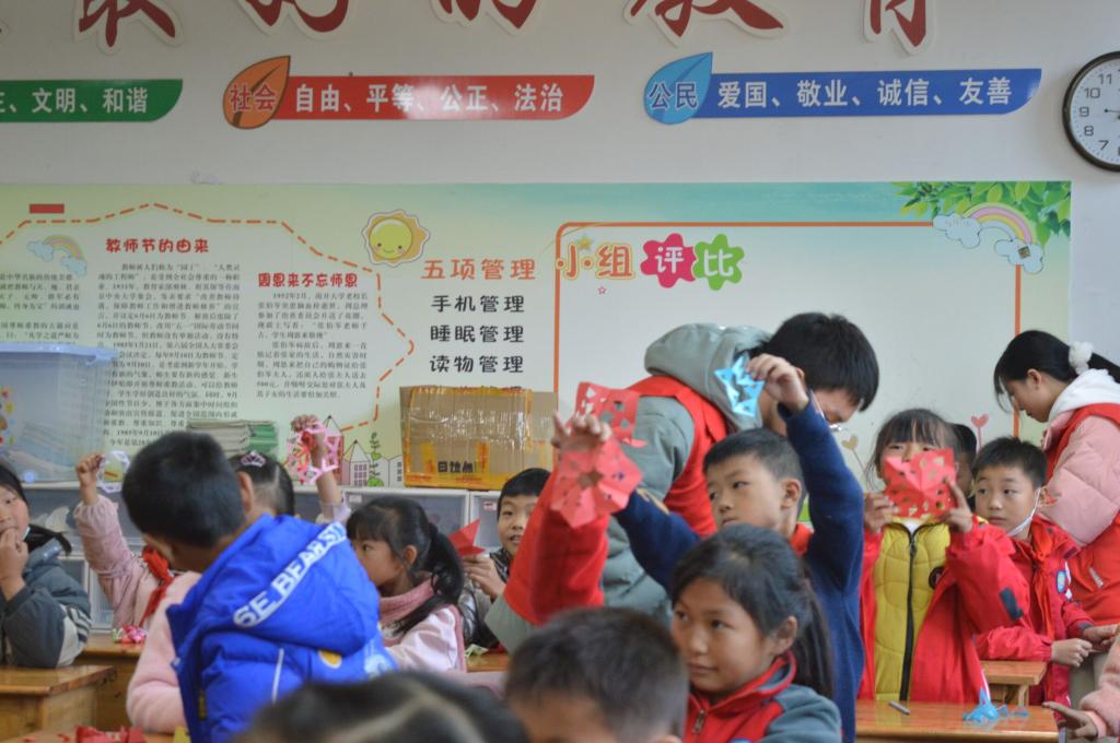 小手拉大手,志愿路上一起走。课堂上,志愿者用风趣幽默的话语向学生们讲述了有关剪纸的神话传说和剪纸的艺术欣赏,以动漫视频的形式给小朋友们介绍了剪纸的起源和发展,并向大家展示了手撕、剪切等剪纸艺术手法,同学们听得津津有味,对剪纸产生了浓厚的兴趣,聚精会神,挥舞着手中的剪刀,将一张张普普通通的纸,裁剪成灵动的模样,一双双明亮的眼睛透露出对剪纸文化的兴趣与喜爱,课堂上充满了生气与活力。