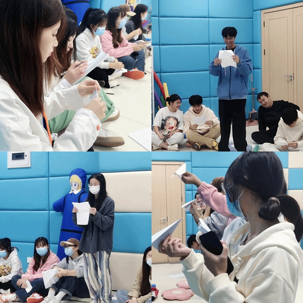 随后,便是一个个小活动的开展。“希望在异科导师的带领下收获什么?”同学们你瞅瞅我我瞅瞅你,似乎并没有那么快地想好答案。“老师是学心理学的,可能这一块儿的知识储备比较丰富一些,当然啦其他你们想知道的,希望获得的,都可以写下来。”......随着笔尖的沙沙声,同学们都在认真地思考着,写着。“将纸折成纸飞机”“我数123,我们一起放飞手中的纸飞机哦。”同学们全体背对着将纸飞机从自己的身后飞出去,转过头来,自己的纸飞机早已不知在何处,于是随机捡起一架自己脚下并不属于自己的纸飞机。张老师让同学们分享一下纸飞机中的内容,“我这里有一个:想有机会与女同学深入交流!”蔡娜老师的一句话把原本还有些放不开的同学一下子带入到了氛围当中,同学们开始积极地分享起来。一架架纸飞机里面承载的是同学们对未来的展望,张老师说那也是她工作的方向。