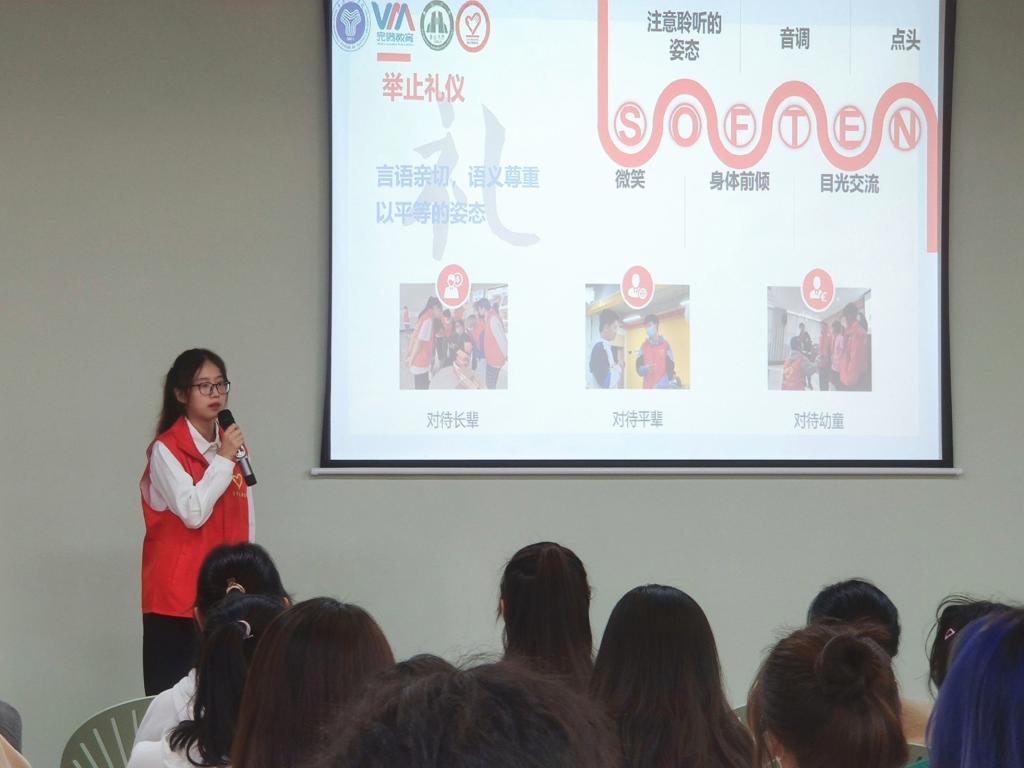 培训初始,首先由淬炼·国际商学院青年志愿者协会的干部杨茜从对“礼”文化的基本内涵为出发点开启宣讲篇章,介绍了志愿者形象管理的有关内容。随后,杨茜同学再从书院“礼”文化过渡到围绕志愿服务、志愿精神等理论与内涵展开讲解,着重引申出志愿礼仪的相关概念与实际正确做法。