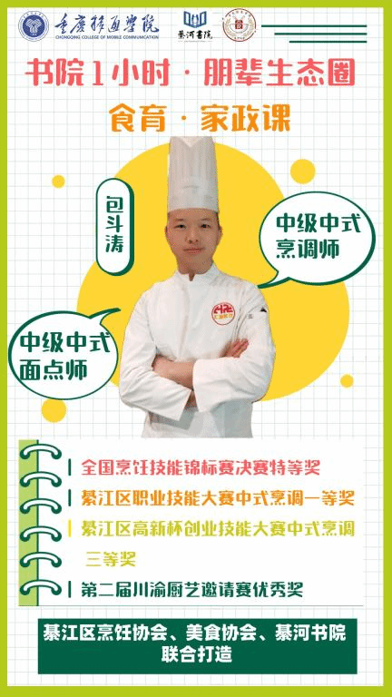 为打造“技能共享”綦河书院共享社区,推动书院迈向开放式学习生活文化圈,给书院学子提供鲜活、具体、生动、多元的学习平台,实现实践育人、文化育人、服务育人。根据《中共中央国务院关于全面加强新时代大中小学劳动教育的意见》设计,綦河书院联合綦江区烹饪协会、美食协会共同打造“书院1小时”·朋辈生态圈——食育·家政课。本次活动邀请烹饪专家包斗涛老师对綦河书院学子进行烹饪授课,引导学生对烹饪产生兴趣,使学生掌握基本烹饪技巧,将灶台变课桌。