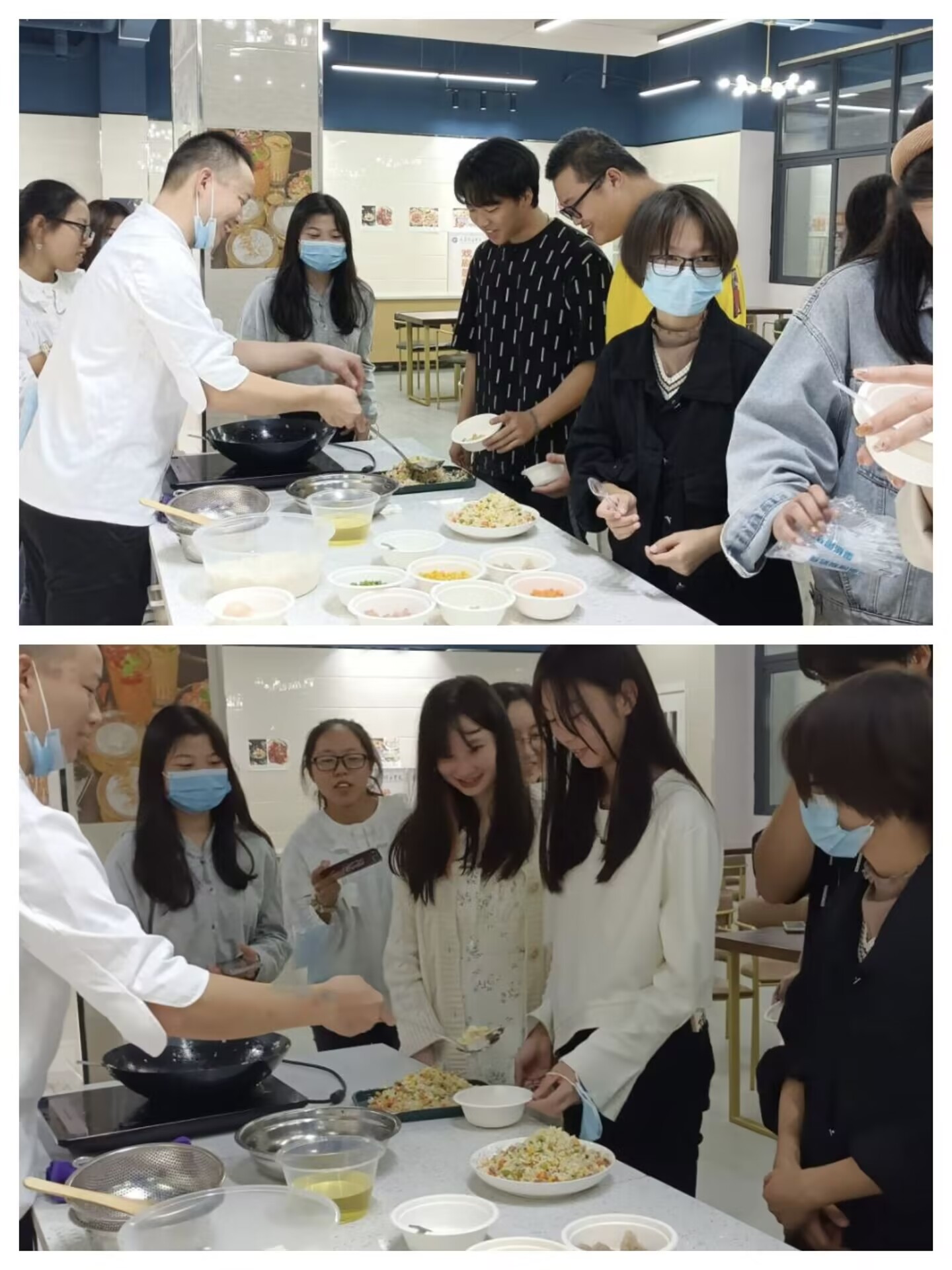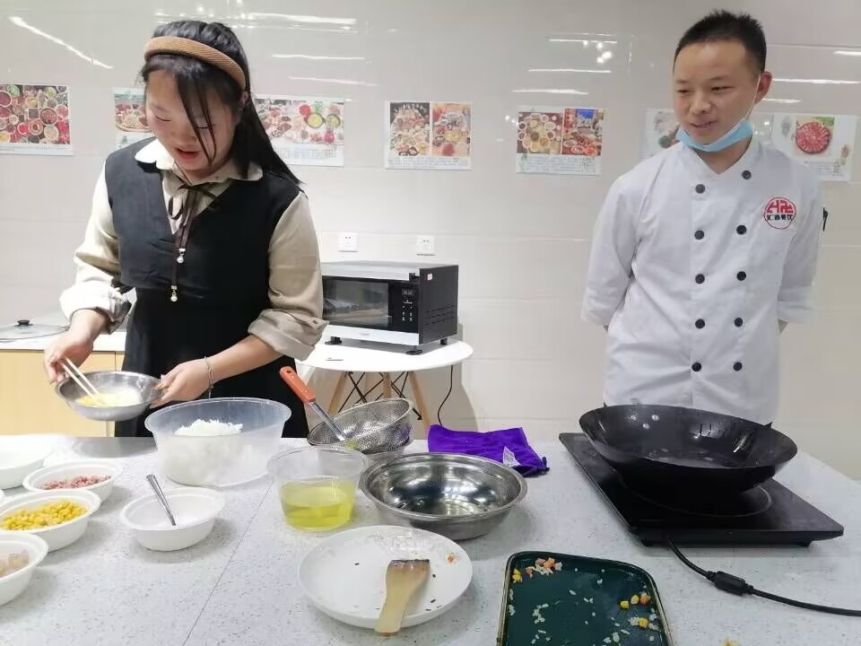 油一点,勺一颠,火一收,金灿灿的扬州炒饭便呈现在同学们的眼前,在同学们跃跃欲试的目光中,饭勺从包老师手上递交给了前来学习的同学。包老师站在一旁,耐心的指导着每一个步骤,希望能通过这种方式,在保护同学们操作安全的前提下,锻炼同学们的动手能力。虽然场面温馨,但由于缺少亲自动手的机会,同学们的操作可谓鸡飞蛋打,鸡蛋碎的七零八落,包老师看到同学们此般作为,不禁笑道:“如果都这样炒鸡蛋,炒出来的鸡蛋碎都不够大家一起分!”此话一出,不禁调节了厨房里同学们拘谨的气氛,也让同学们缓解了来自“课程”的紧张情绪,让同学们能够在接下来的烹饪中大放光彩。