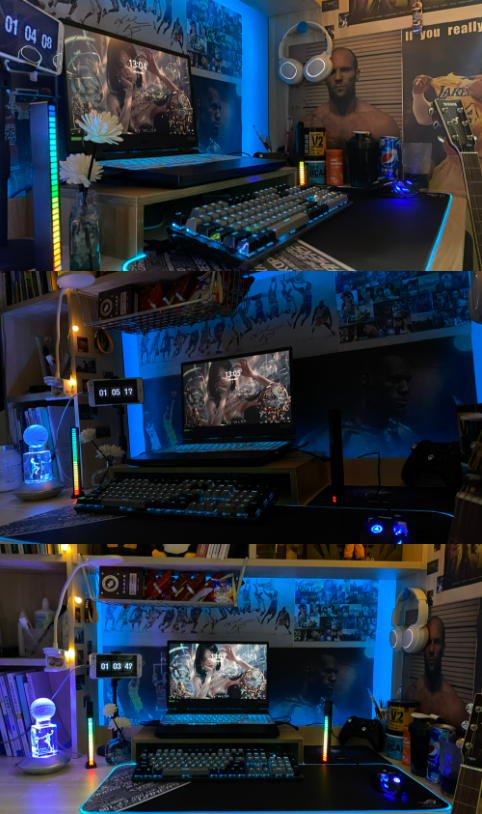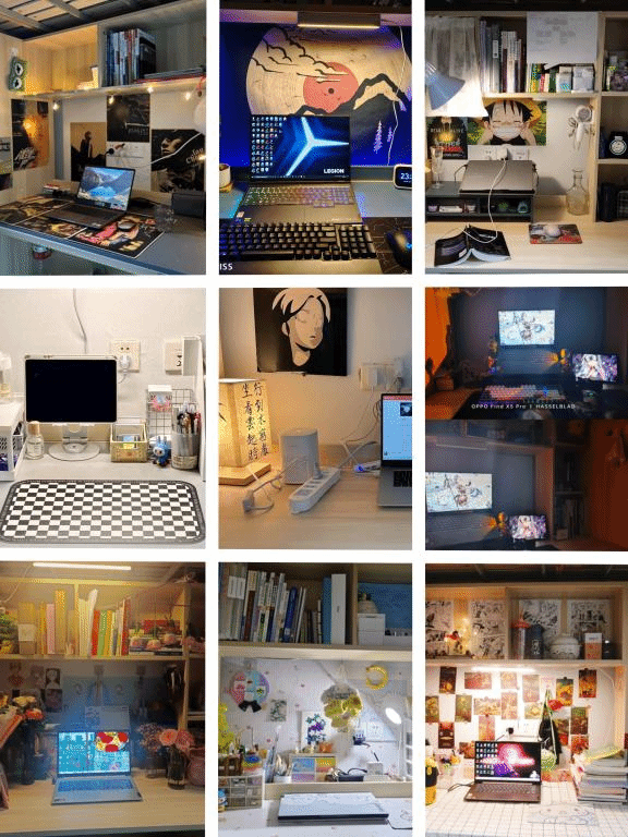 简单实用的原木风、炫酷多彩的电竞风、温馨可爱的玩偶风,还有极简禅意的中式风等等,不同的桌搭风格展现出了同学们不同的兴趣爱好和个性追求。其中电竞风尤为吸睛,蔚蓝色灯带营造出书桌立面的深邃感,多样的电子设备让桌面科技感爆棚,精巧实用的收纳工具也让空间得以合理运用,简直是男生们的梦中情桌。