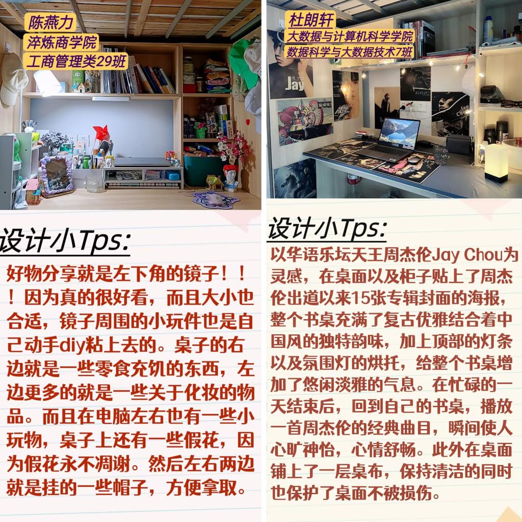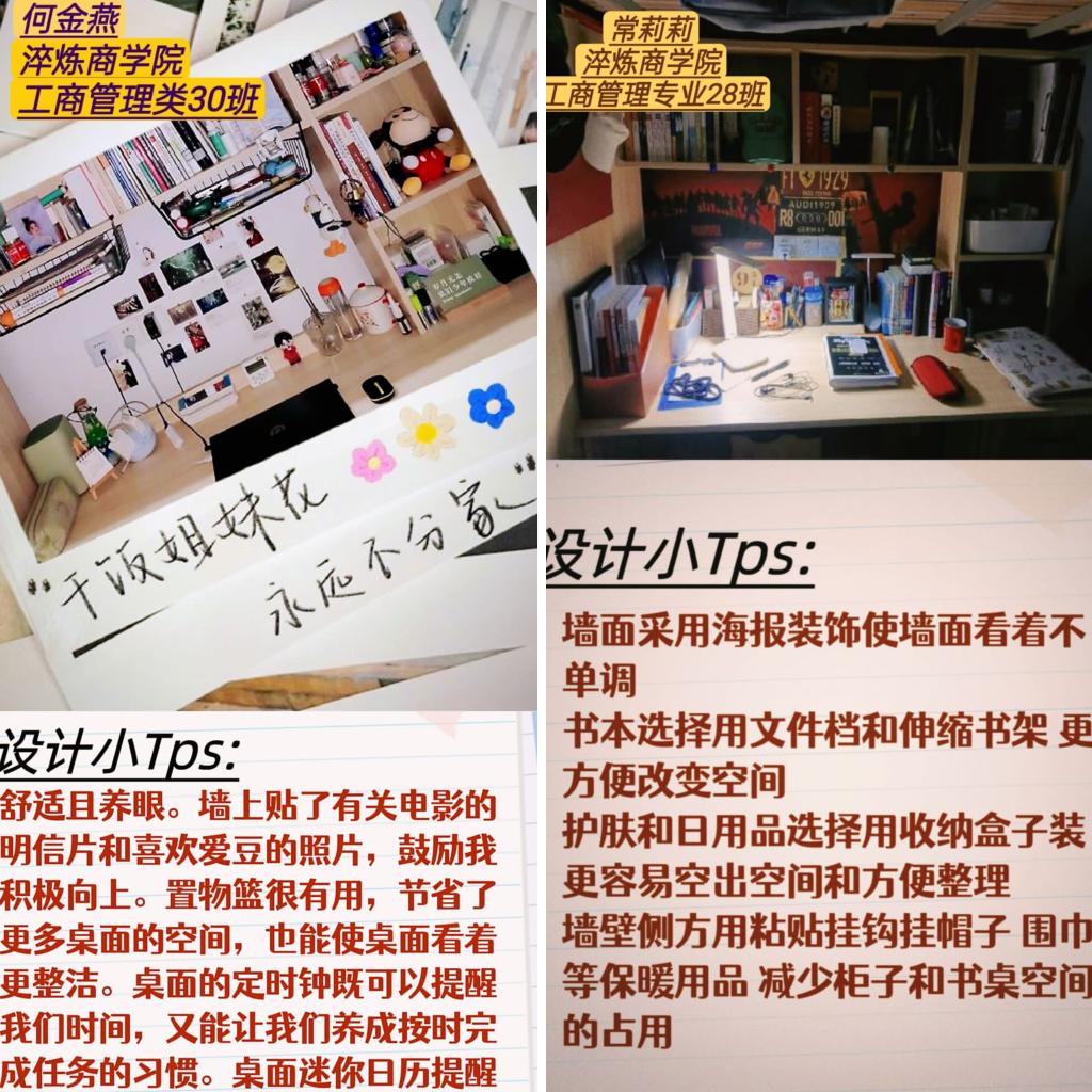 值得一提的是,本次活动不仅收集了风格多变的桌搭作品,同时也收获了许多参与学子对桌面改造的方案,后续,玉棠书院将围绕灵感来源、空间规划、好物清单等内容,对出圈桌搭作品的改造方案进行广泛宣传,为书院学子们提供有依据、有价值的书桌改造思路。
