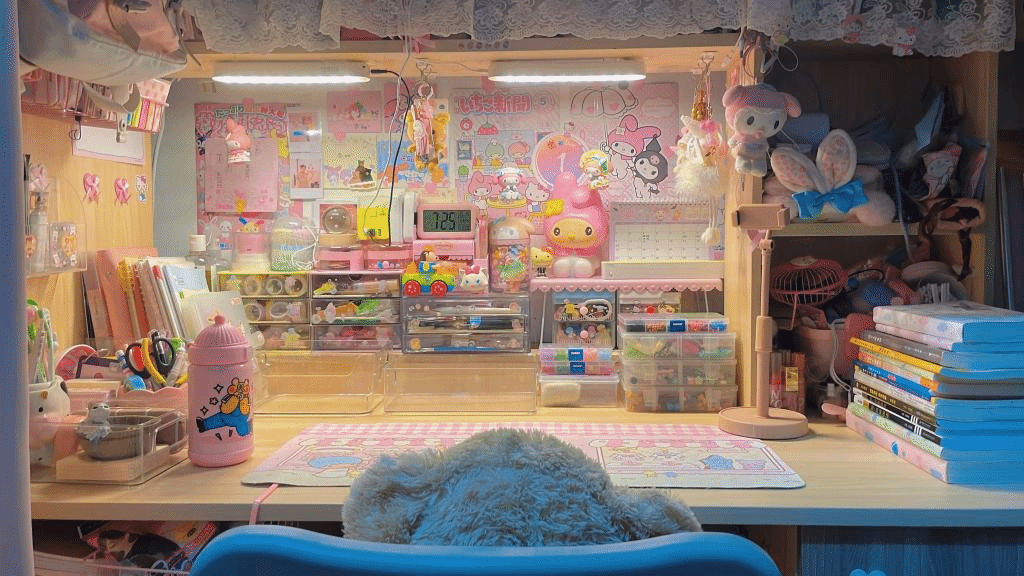 与此截然不同的是,来自2021级葛萱同学的桌搭作品,扑面而来的少女气息席卷了桌面的每一个角落,可爱的水杯、贴纸、鼠标垫造就了一片粉色的海洋,当她一坐在书桌前就可以遨游在这片温馨安逸的角落里。