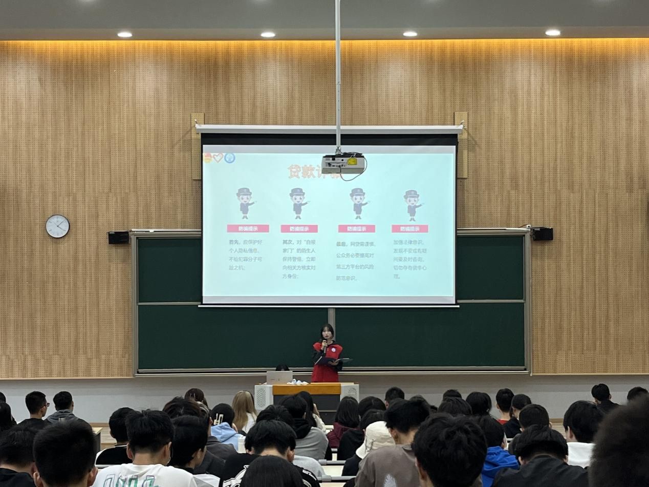 此次宣讲从“电信诈骗”“贷款诈骗”“赌博诈骗”及“网络诈骗”四个方面进行宣讲。随着网络技术的发展,以电子信息技术为方式的高科技犯罪层出不穷,其中网络诈骗就为常见的校内诈骗手段。主讲人通过自身的亲身经历与身边真实存在的案例来介绍虚假危险网址骗取重要信息、假冒银行工作人员进行贷款诈骗、引诱贷款诈骗等诈骗形式,向同学们深入宣传诈骗的表现形式,切身感受诈骗的危害性以及潜伏性,切实提高同学们防范诈骗的意识。