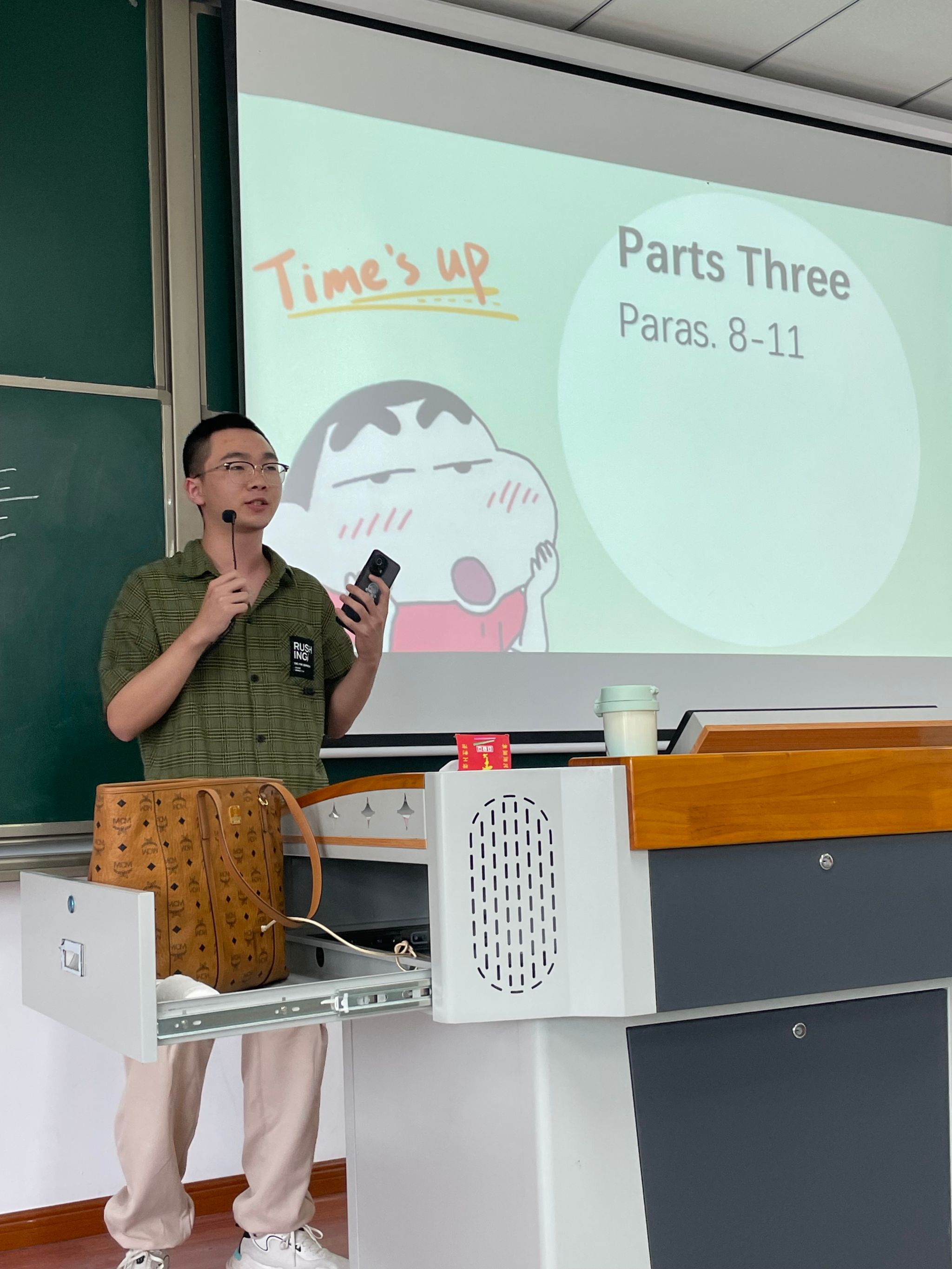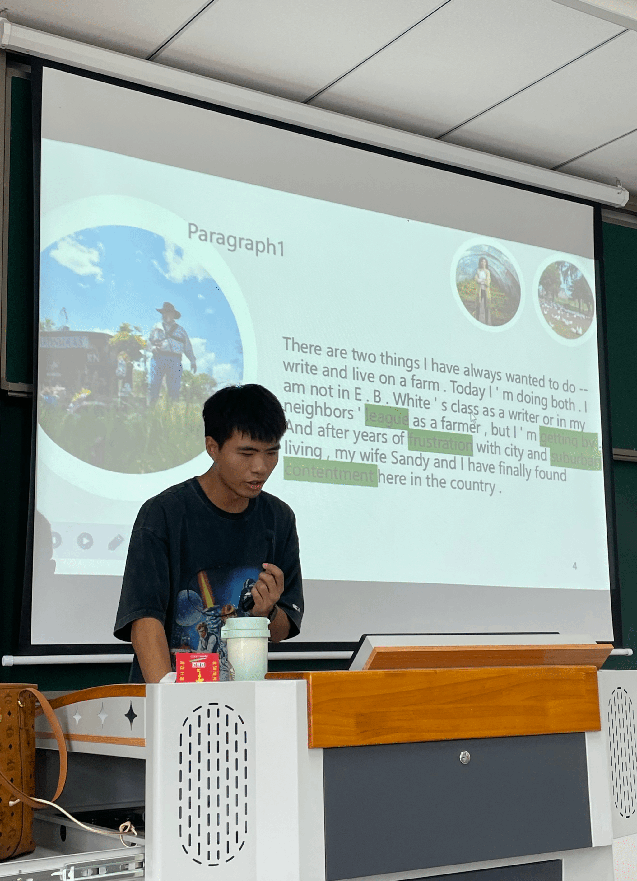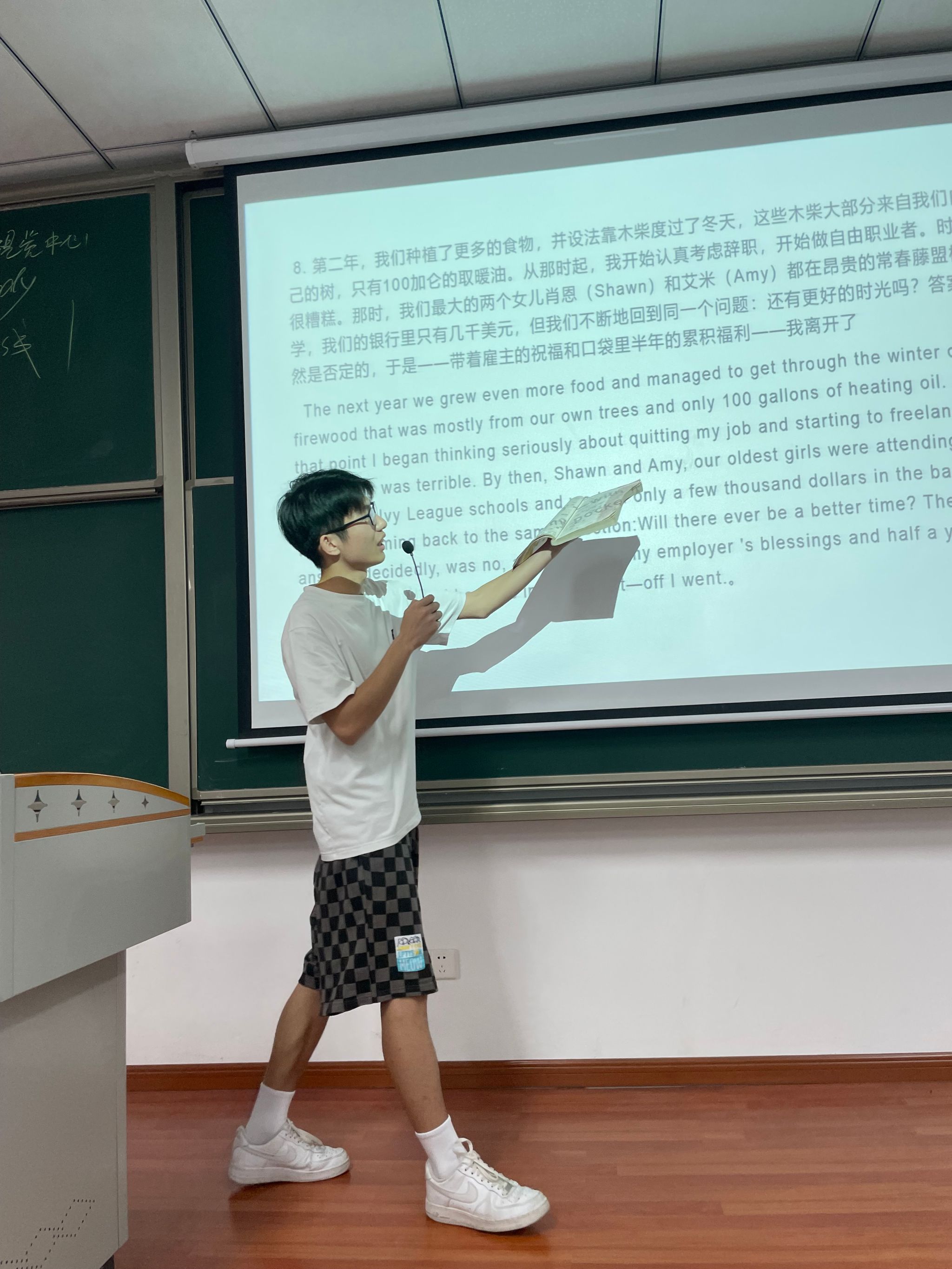 在“翻转课堂上”,负责成果展示的同学在努力扮演好“小老师”的角色,将自己课堂外学习到的知识分享给在座的同学们。新手“小老师”们学着老师的模样,为同学们讲解文章重点,解答学习疑惑,甚至给同学们布置课后作业。