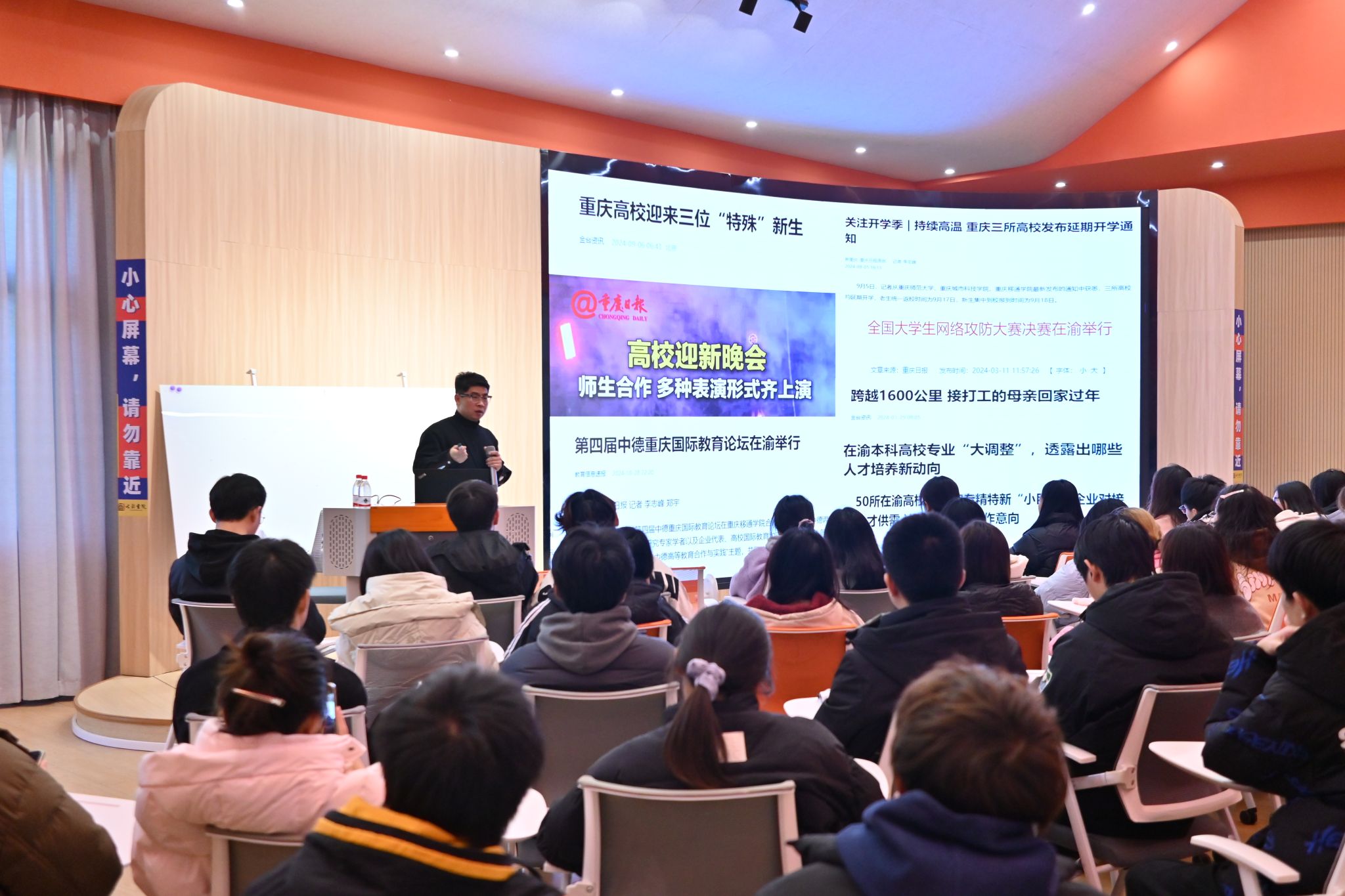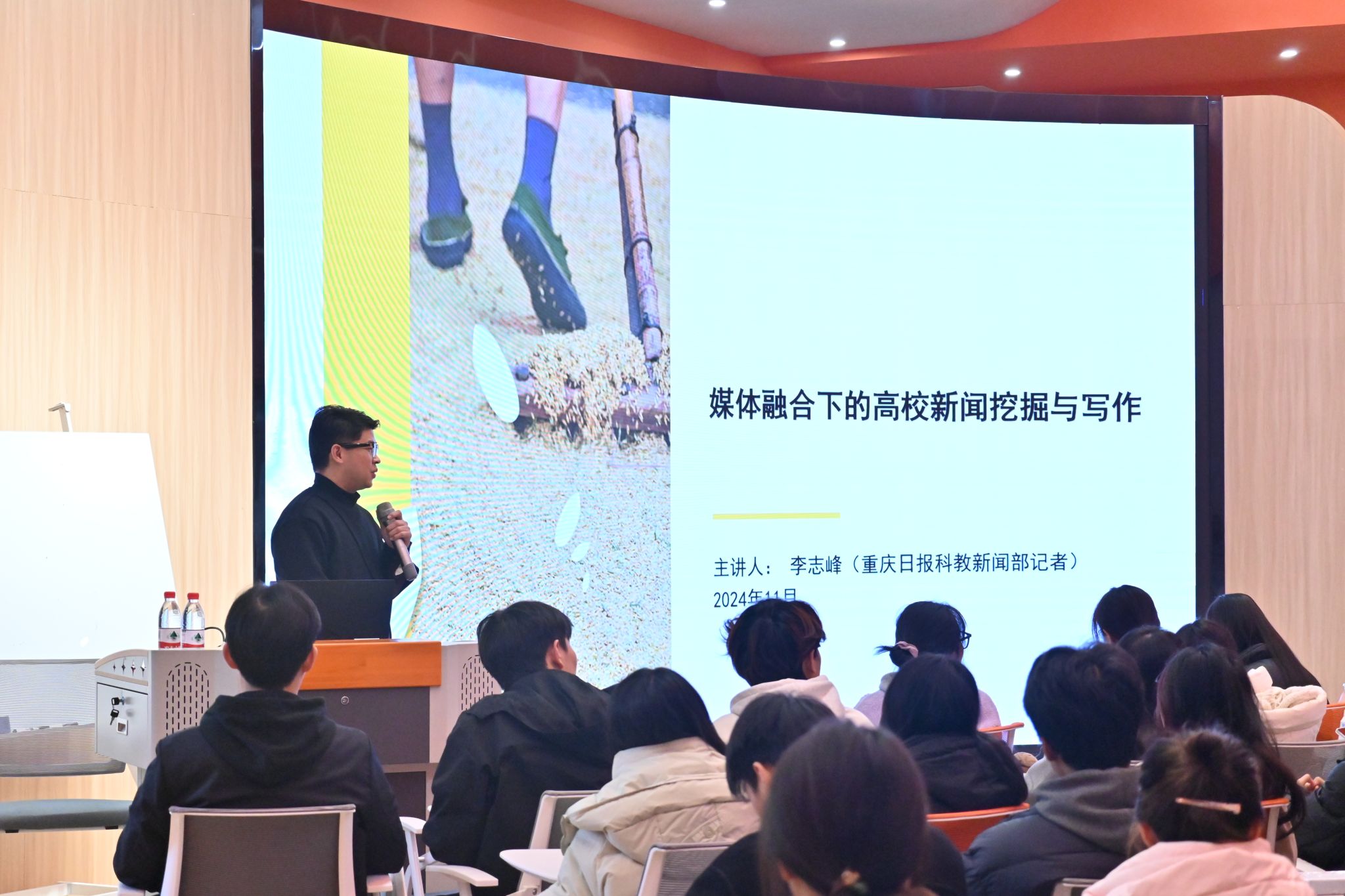 本次讲座邀请到重庆日报科教新闻部记者李志峰,李志峰老师2006年大学毕业进入重庆日报,扎根科教新闻采编一线十余年。先后参与过2008“5.12”汶川地震、2008北京奥运会、学习兄弟省市、2023年杭州第19届亚运会、2024年重庆市第七届运动会等重大事件和大型主题报道宣传。多篇作品荣获全国省级党报好新闻及重庆市新闻奖一、二、三等奖。曾连续四年获评重庆日报明星记者。
