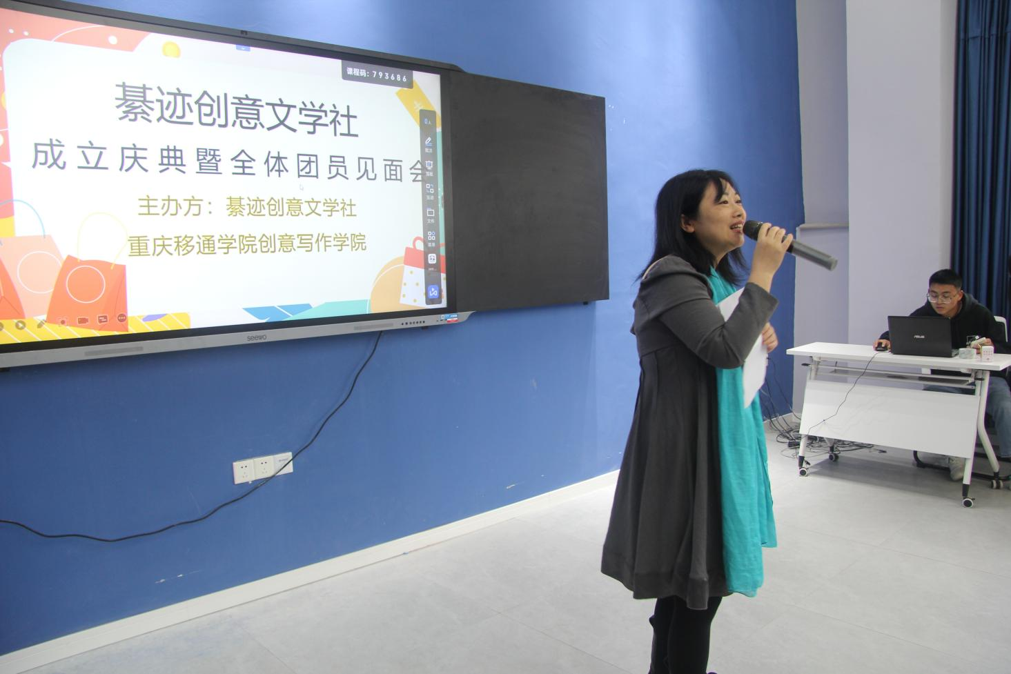 萧婷婷老师真诚地对团委领导和创意写作学院的大力扶持表达了由衷感谢。她首先介绍了綦迹创意文学社创立的目的:社团是为学生建立一个锻炼自我,走出传统文学创作模式,突破固有的文创框架,与社会文创热点融合,进行各种形式的创意文本创作,提高他们的综合性实践能力。