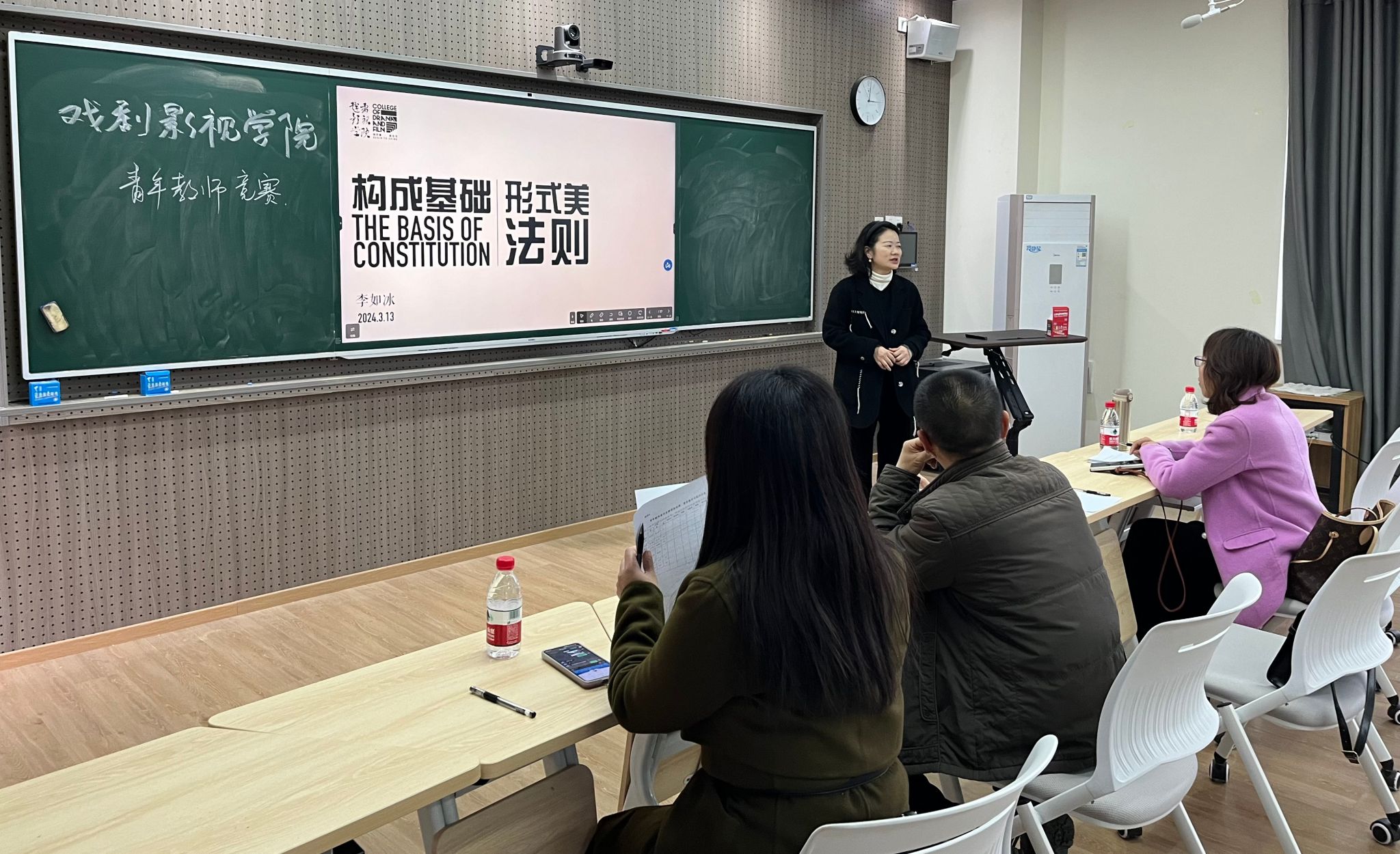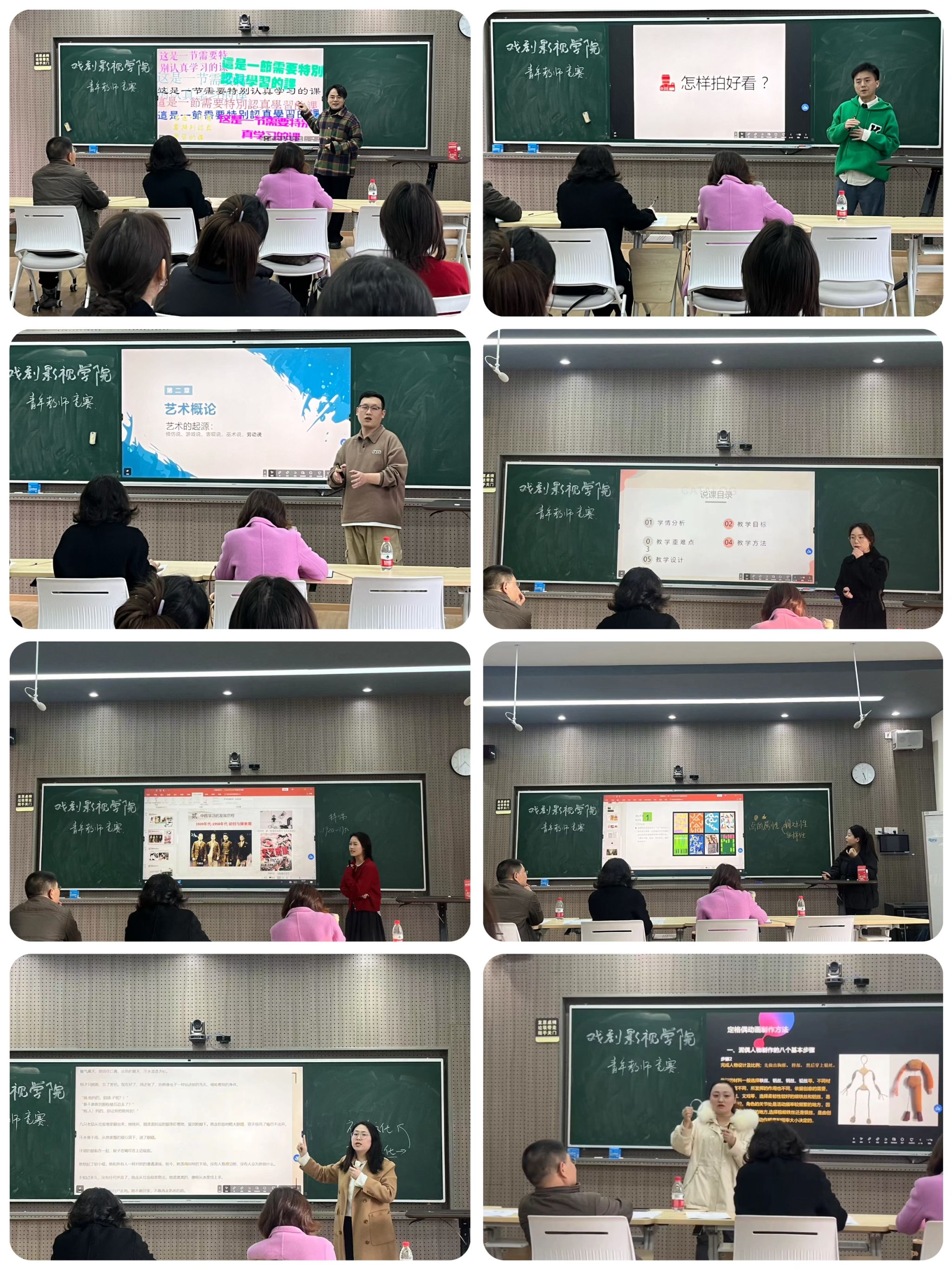 本次讲课比赛共有8位青年教师参加,参赛老师在规定时间(15分钟)内,就自己所担任的课程进行课程讲解。8位老师8种风格,但凭着同一种对教学的热爱,火力全开,激情澎湃,他们的热情感染了在场的每一个人。参赛老师不仅准备充分,在PPT的准备和制作上铆足了劲,各展所长。同时发挥艺术专业优势,授课重点突出、逻辑分明、论点独到,对具体问题能够有深刻的分析。