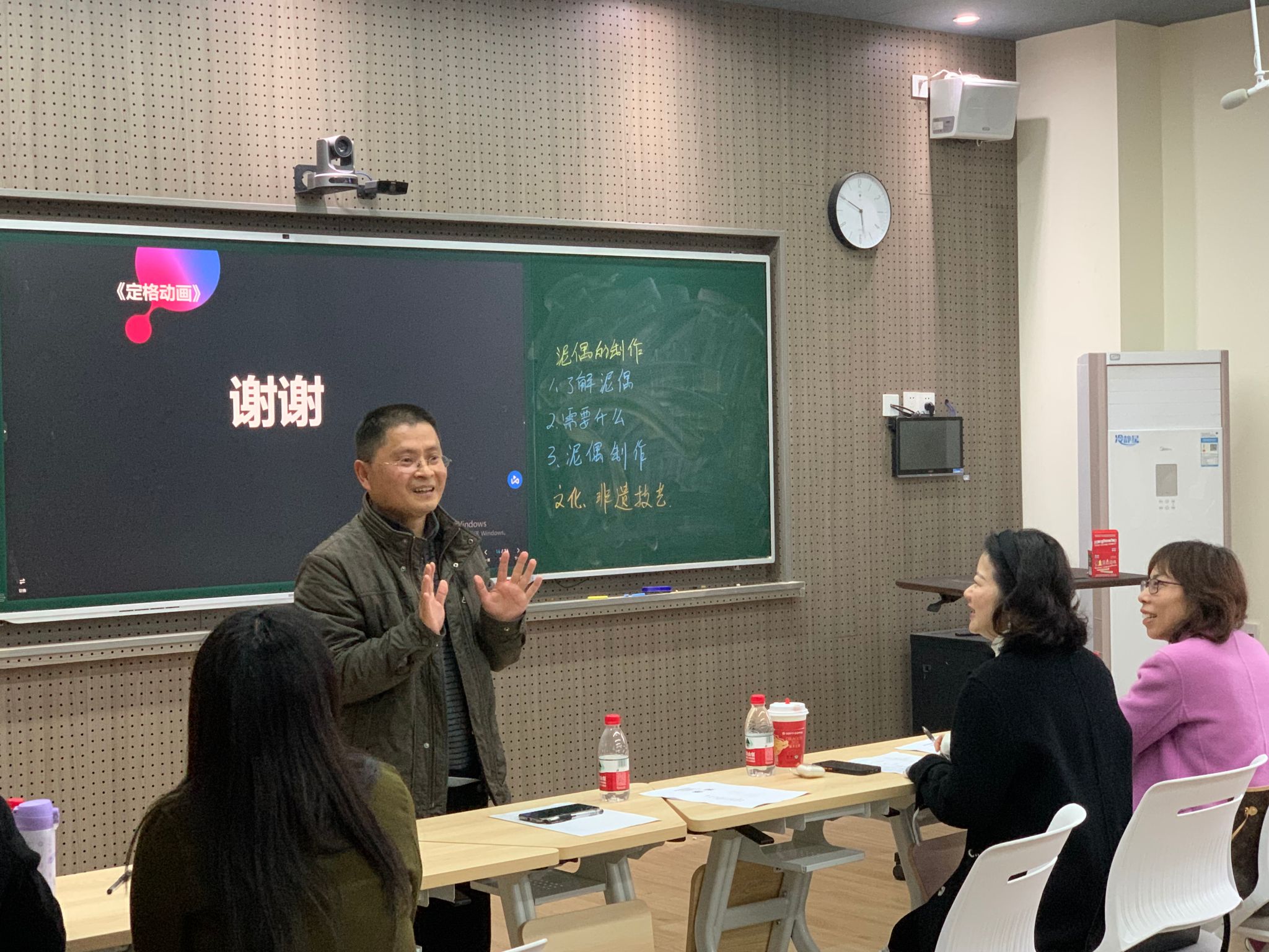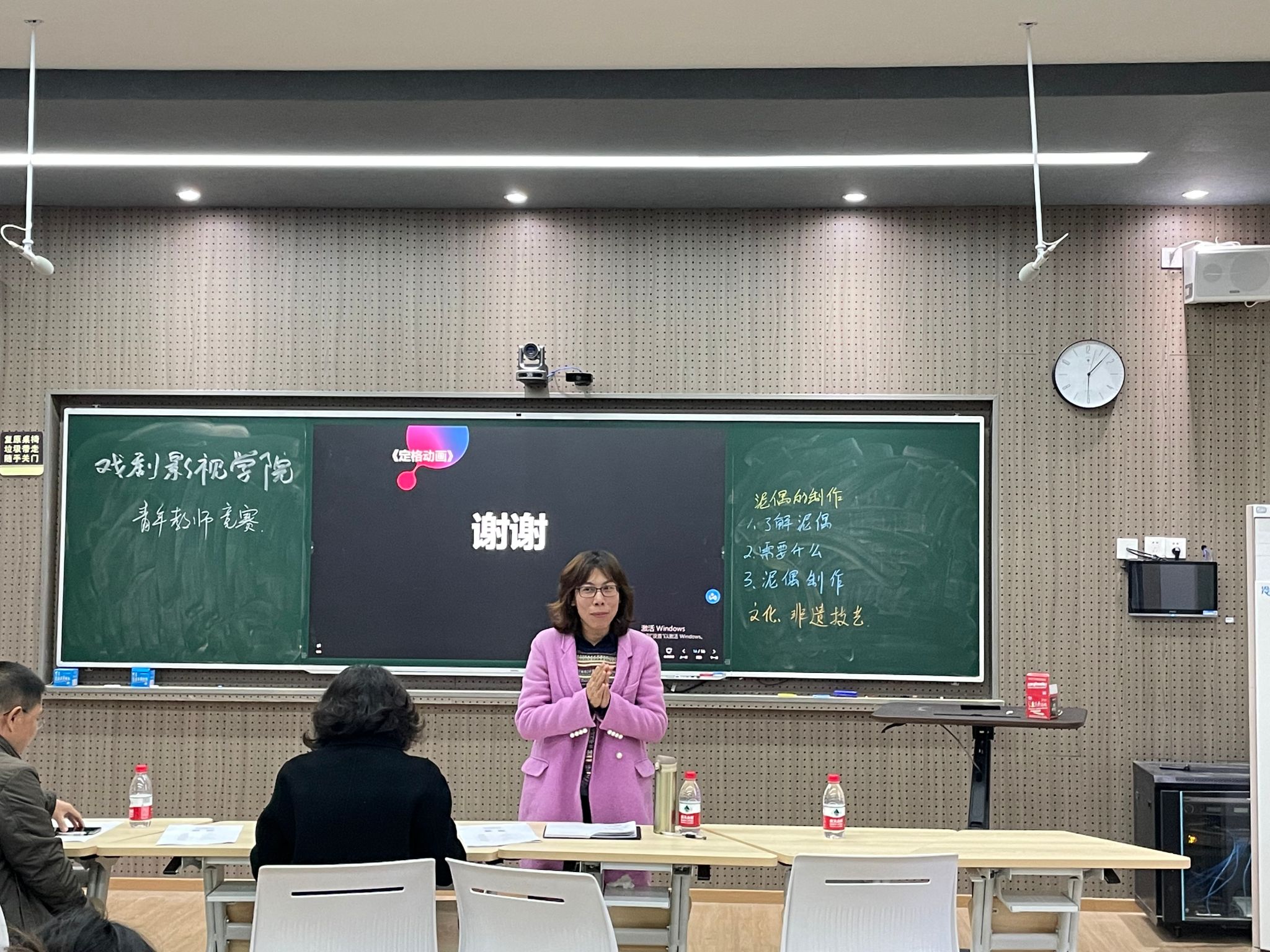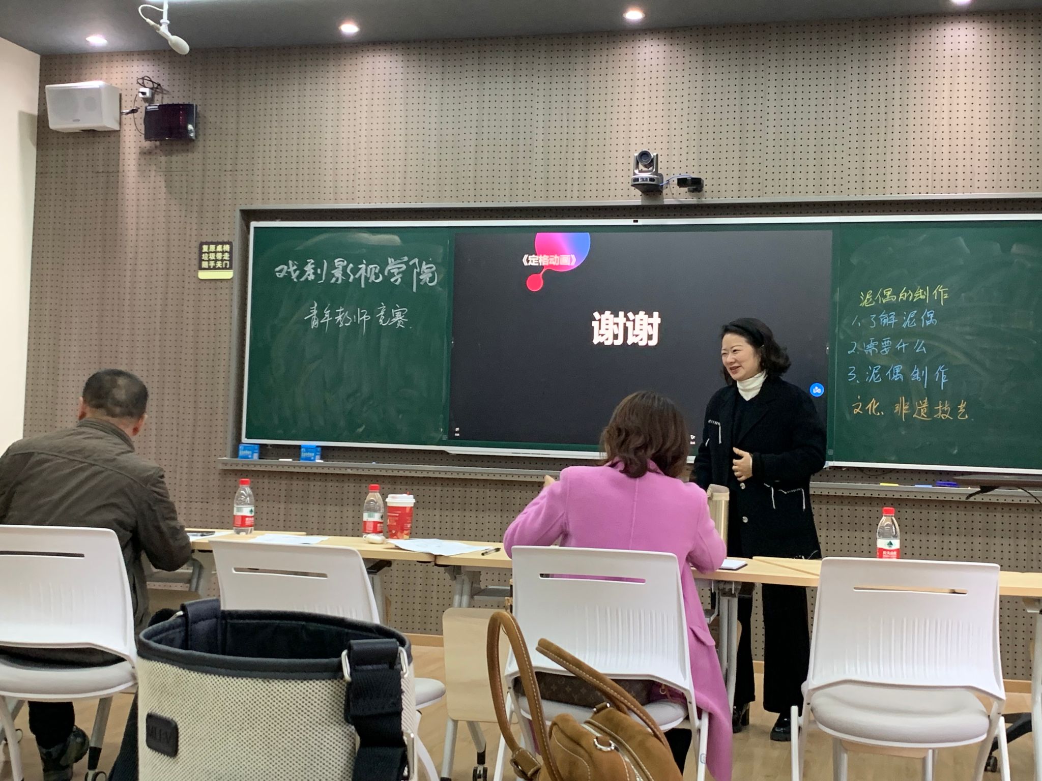 李如冰老师在《构成基础形式美法则》课程中,教授大家如何从变化与统一中找到审美法则,讲授立意深刻、清晰明了。杨帆老师的《艺术概论》课程探索了艺术和劳动的关系,并从古代文字追溯艺术的起源。郭嘉琦老师的《电影理论》课,以《少年的你》的剧本为例,重点讲解视觉文化与概念文化在形象呈现上的区别。熊琳老师通过中国动画史上著名影片,讲解了中国动画学派的发展历程、代表作品、题材特征。秦小花老师在《表情动画》课程中,以动画片《哪吒》的片段为导入,探索该动画片制作人物的可借鉴之处。王华丽老师以不同的海报设计为案例,分析了平面构成的基本要素——点。最后,袁梦茹展示了泥偶制作的八个基本步骤。选手们娴熟自如的使用PPT展示课程,幽默、风趣的阐述了自己的观点、方法和思路,他们的表现获得了评委老师和在场观众的一致好评。