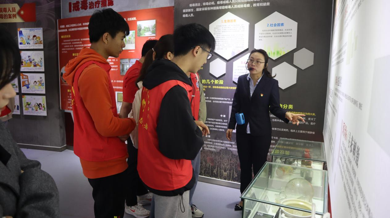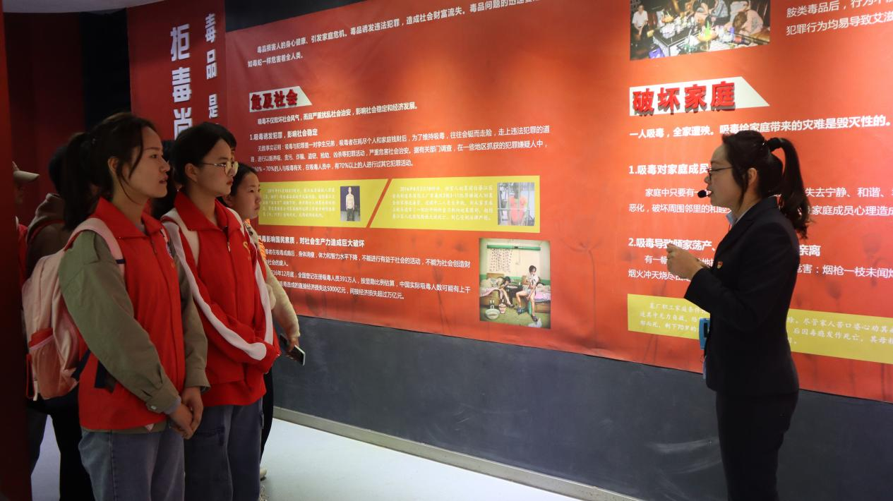 过程中,讲解员着重为大家介绍了发生在身边的毒品教训,在以案说法影片观看区,师生们看到了一个个鲜活的真实案例,一张张因吸食毒品而惨不忍睹的图片,一个个吸毒者触目惊心的悲惨经历,一件件骇人听闻的涉毒违法案例,让大家深感震撼,深刻认识到了当前禁毒形势的严峻性和开展禁毒工作的重要性和紧迫性,坚定了与毒品斗争到底的信心与决心。