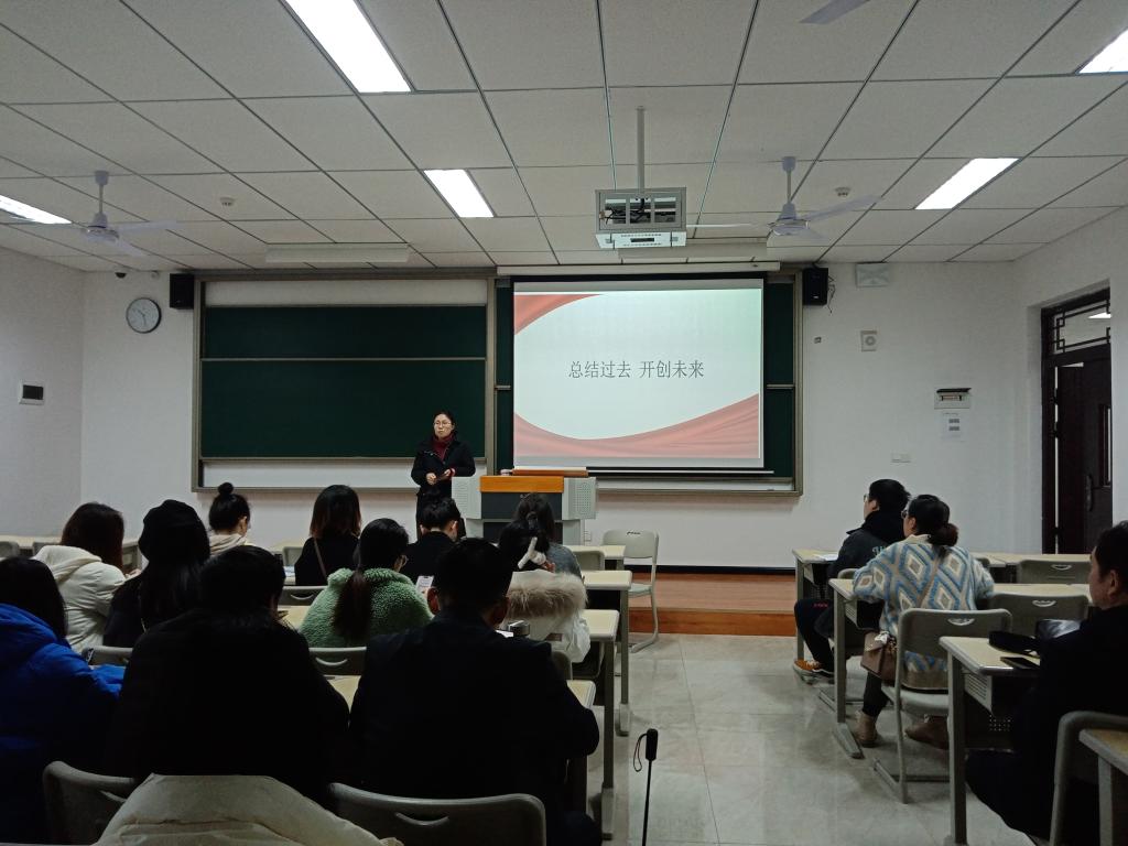 其次,她对上学期遗留工作作了部署:一是做好上学期的期末考试工作;二是及时向授课班级的学生传达所授课程的学习、考试等要求;三是做好上学期过程考核和期末考核材料的归档工作;四是按时完成假期网络培训工作;五是开展“记录新时代,喜迎二十大”微视频决赛和“喜迎二十大,时代新人讲好故事”课决赛。