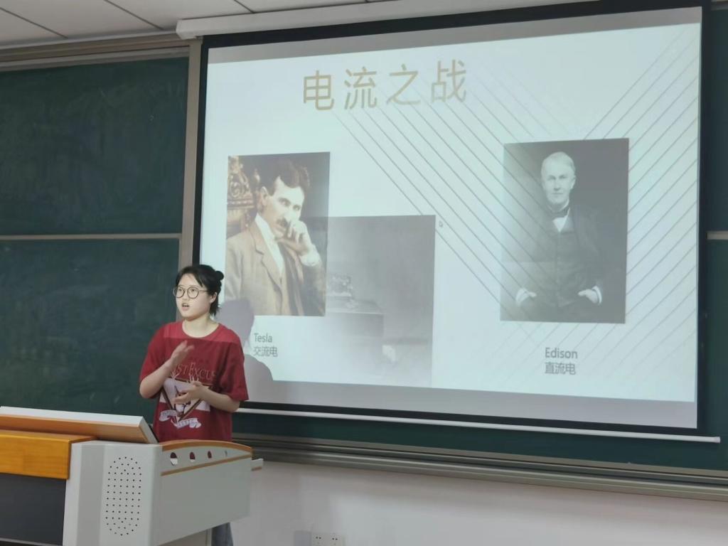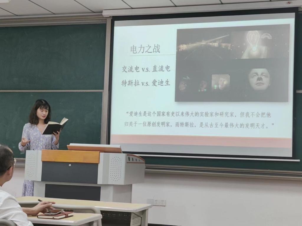 冯哲君老师作为第二名发言者给老师们播放了一段相关视频,里面系统的总结了特斯拉的发明,事迹,性格等。接着,通过解读《电流之战》,蒋娜老师讲出了自己的心得。卢俊婷老师将特斯拉与爱迪生进行对比,突出展示了两人思维模式的区别:一人是商人,一人是真正的发明家。同时赞誉特斯拉为被内心创造力推动的人。