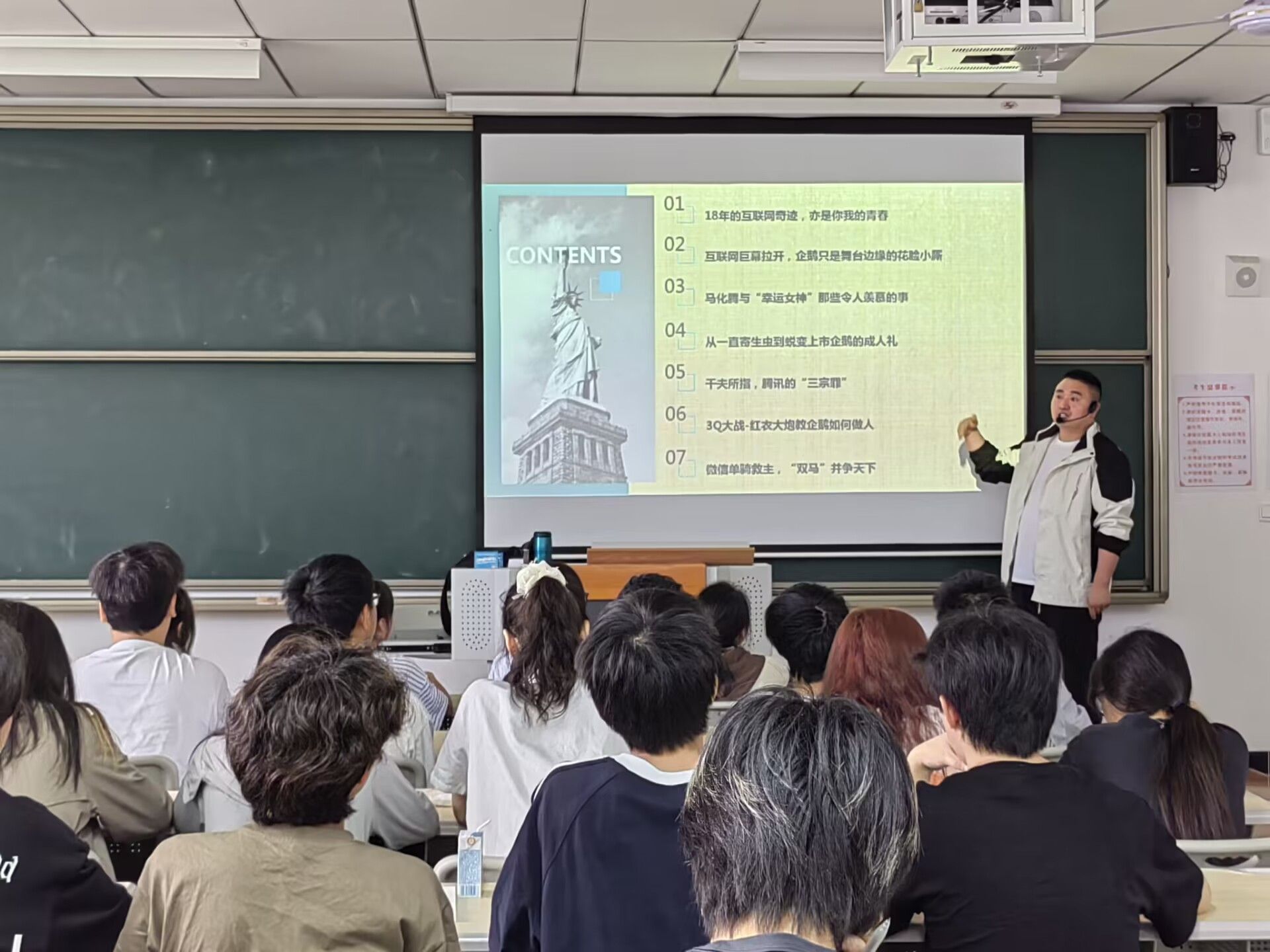 乔兴刚老师于4月15日在贤者楼311,与学生一起分享了《腾讯传》的心得体会。乔老师认为腾讯的成功并非一蹴而就,而是经历了无数的挫折和磨难。在创业初期,腾讯曾经因为资金紧张而不得不裁员、压缩开支,同时市场上也存在着众多竞争对手,腾讯一度陷入了困境,然而,正是这些困难和挑战,锻炼了马化腾的意志和团队凝聚力,最终马化腾带领腾讯团队走出了困境,现如今取得了巨大市场规模成绩。2023级数字经济5班的雷潘、朱千艺、彭旭东等同学纷纷向大家分享了《腾讯传》的阅读感悟。雷潘同学认为,此书不仅帮助他了解了腾讯的成功经验,还对企业的创新、发展和社会责任有了更深刻的认识。这些启示对他自身的成长和发展也具有积极的借鉴意义。