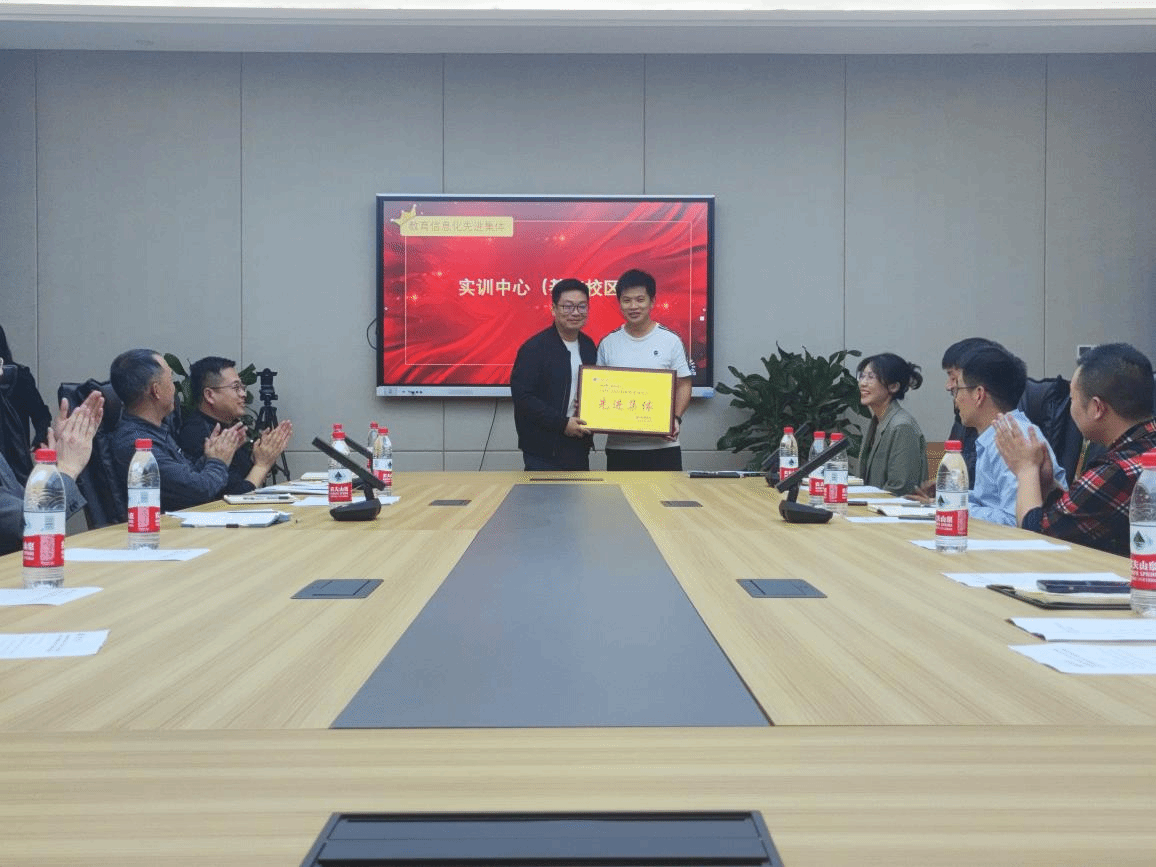 会议第二项议程,周伟副校长宣读2021-2022学年教育信息化工作表彰公文及获奖名单。张雪占副校长依次为先进集体,先进个人颁发奖牌及证书。
