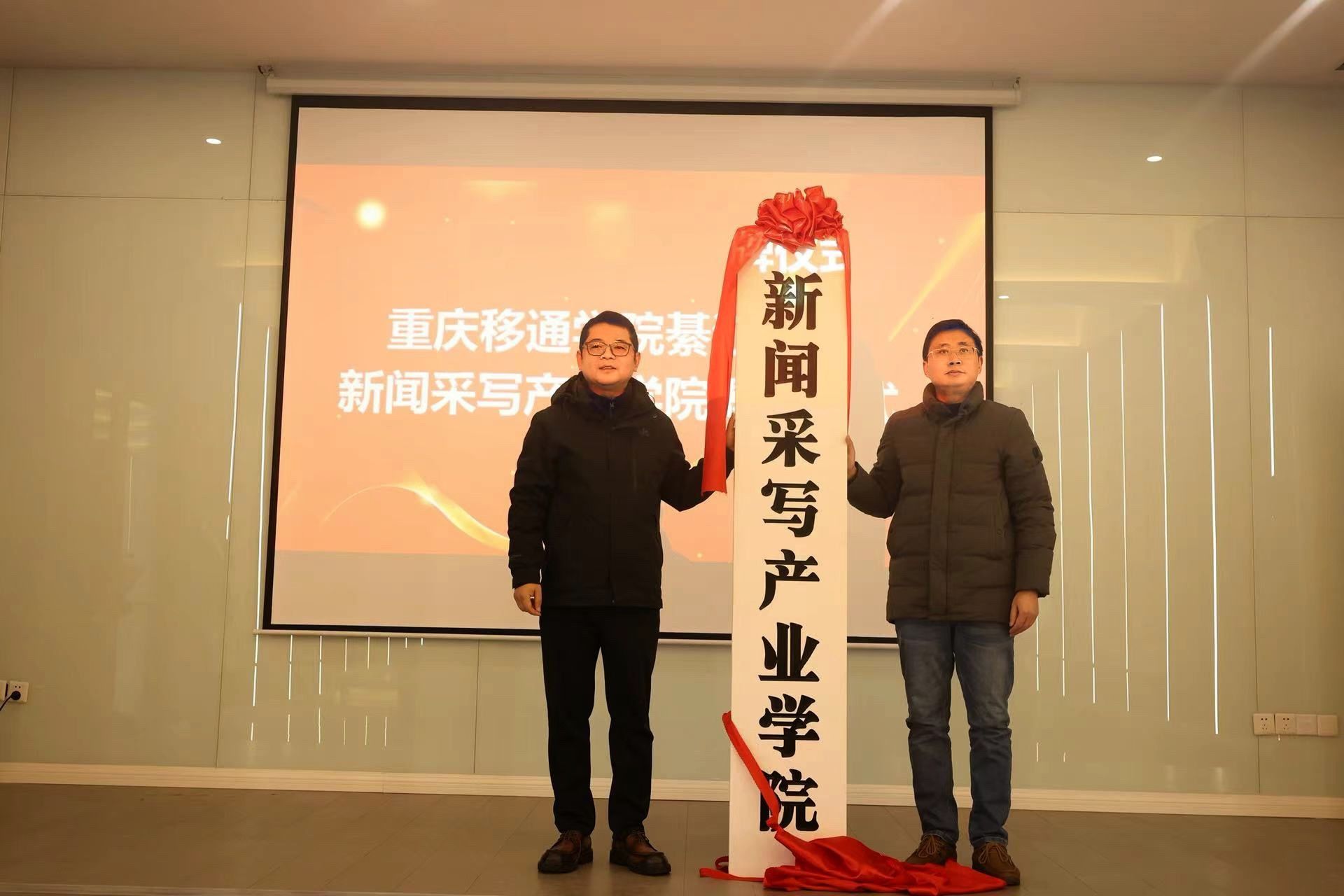 王永周和张平为綦江校区新闻采写产业学院揭牌。