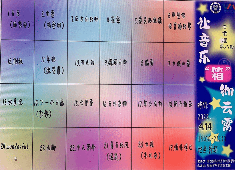 为什么歌声会让人激情澎湃?为什么人会让我们身处宁静的草原?为什么音乐能让人潸然泪下?这就是声音的魅力!这就是音乐的魔力!音乐可以丰富校园音乐文化,给校园增加艺术气息。为了让同学们的课余生活不再枯燥,重庆移通学院綦江校区大数据与计算机科学学院甲骨文艺术团为同学们准备了一场音乐之旅,于2023年4月14日在足球场举行了主题为“让音乐‘箱’彻云霄!”的第八期綦河音乐活动。在这里同学们可以感受到音乐的无比魅力,享受到音乐带来的无限乐趣。
