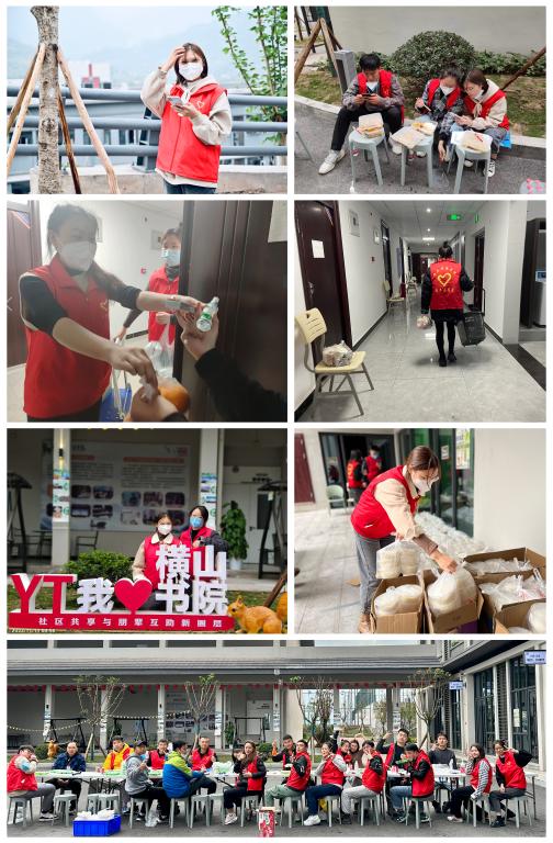 时间不等人,王芳副院长与两位老师踏着深秋的薄霜,一头扎进了冷风里。秋风虽凛冽,但她们身上的红马甲一如满腔热血,在这窄窄的一方校园里传递着无限的温情。从綦河到玉棠,从瀛溪到横山,她们在一眼望不到头的坡道上来回奔走,只为了让同学们可以吃上一口热饭。尽管自己也已饥肠辘辘,但她们满心都是学生的温饱,行色匆匆,心里只有一个念头——快点,再快点。从清晨到傍晚,她们未曾停歇,直到确保所有的同学都填饱了肚子,才放下心来,终于吃上今天的第一口饭。经过一整天的奔忙,志愿者们都累得筋疲力尽,虽然只能坐在路边简简单单对付一顿,但大家都甘之如饴,脸上洋溢着满足的笑容。还未休息片刻,大家又重新起身,投入到了晚上的志愿活动中,一个个火红的身影,早已化作了这场抗疫战斗中传递的火炬,个人奉献的星星之火,终汇聚成了众志成城抗疫的燎原之势。