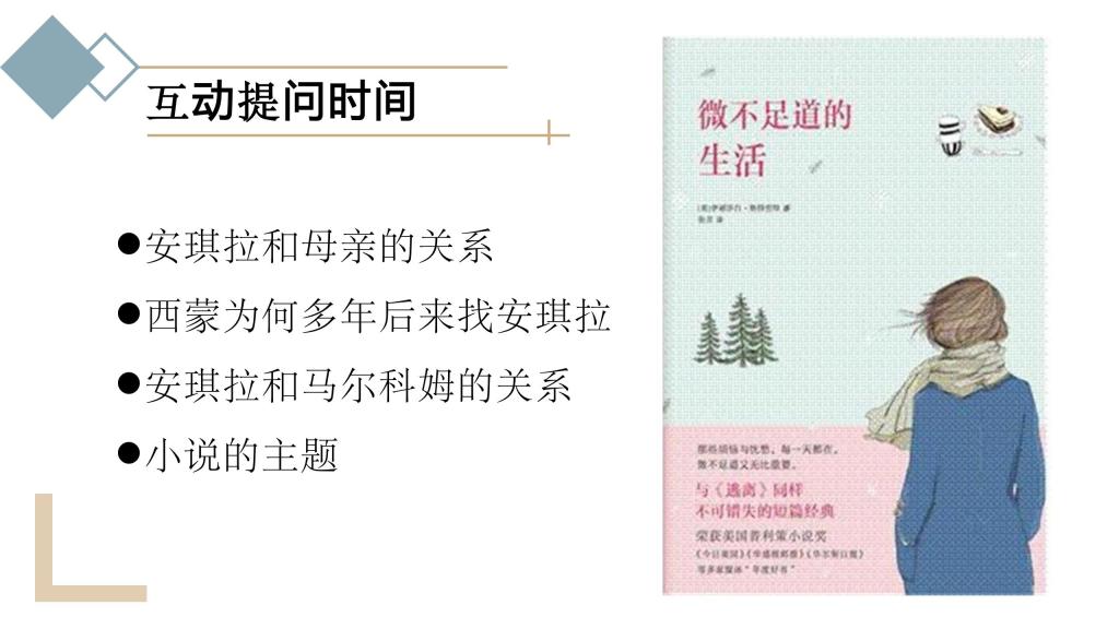 苏老师表示赞许,她进一步阐释道:这篇小说的重点就在“顿悟”,在顿悟中,安琪拉做了一件事情——打电话给马尔科姆提出分手,结束了二十二年的情妇生涯。这是安琪拉第一次对人生做出的主动选择。不同于欧·亨利式的常常在文章情节结尾时突然让人物的心理情境发生出人意料的变化,或使主人公命运陡然逆转。伊丽莎白·斯特劳特在处理命运逆转时,并不在意“戏剧化的情节”,没有偶然事件发生,而是靠主人公内在的觉醒,安琪拉在这个晚上“觉醒”的基础是:她看清了,和任何人相比,她既不更加幸运,也不更加可悲。她一直以来不敢反抗自己的母亲,企图在另一些人身上找到安慰,现在发现那些人也很可悲。安琪拉学会了接纳所有的痛苦,这本就是人生常态,企图通过他人去摆脱痛苦反而成了更深的痛苦。这是一个冬季的深夜,安琪拉终于和自己的命运和解,这将使她永远免除了恐惧。