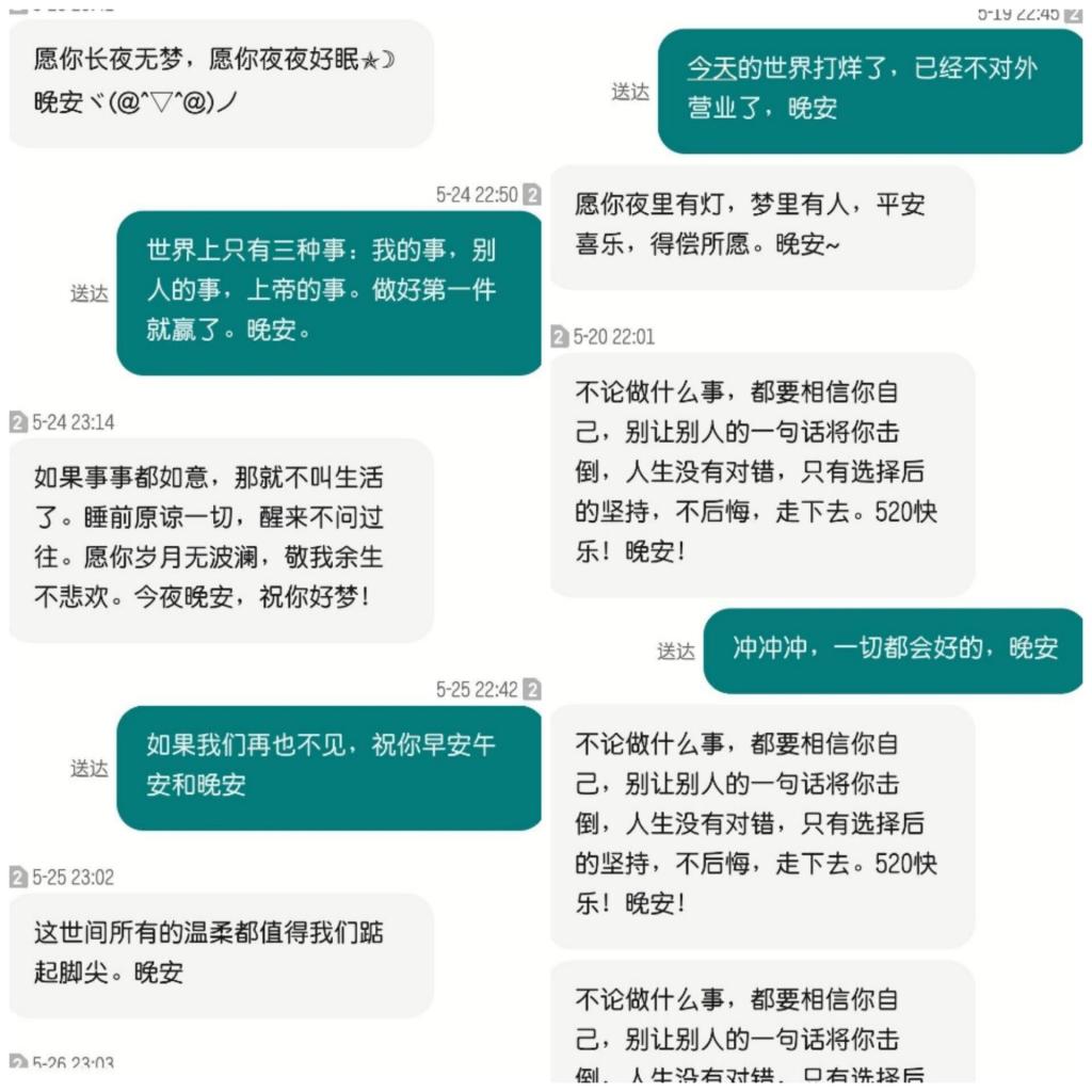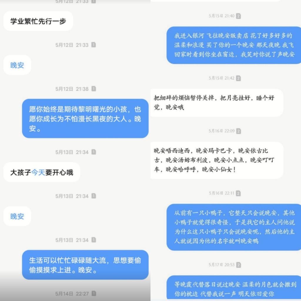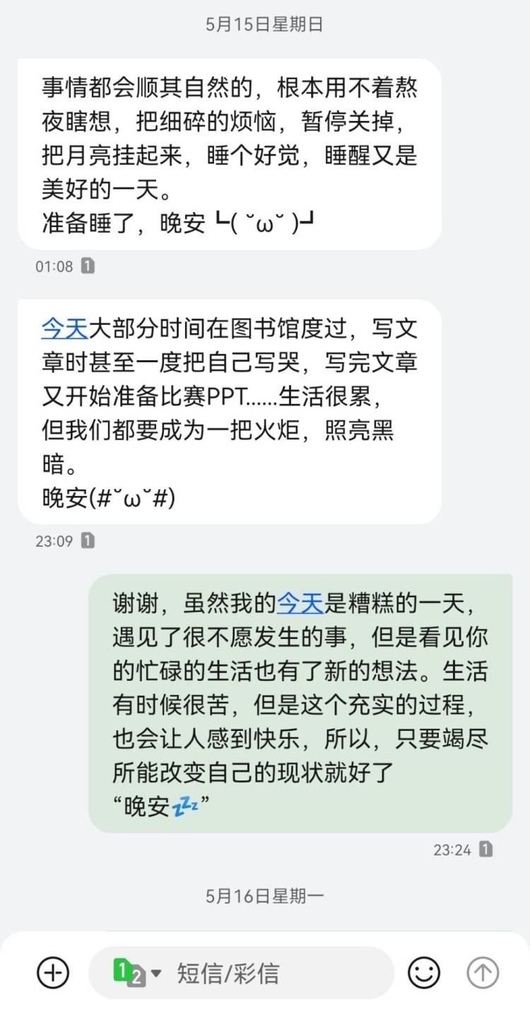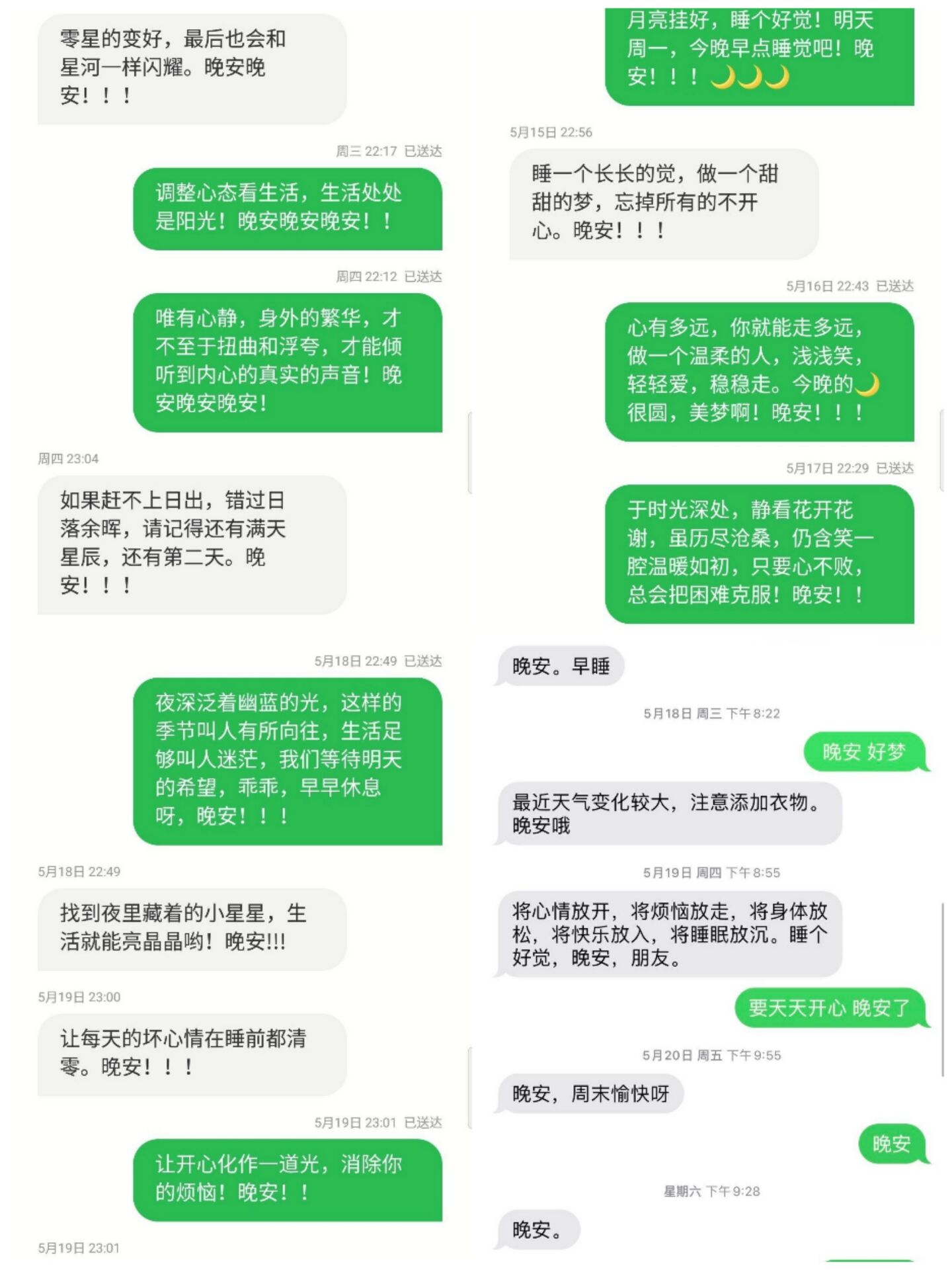 “生活很累,但我们都要成为一把火炬,照亮黑暗,晚安。”每个人的生活生活总是不同的,但忙碌却是永恒不变的主题。当想要放弃的时候,有那么一条消息驱散黑暗出现在你的视野当中,鼓励你继续前进。谭敏同学分享到,有一次她因为一天不愉快的经历而感到难受,又不知如何向朋友倾诉时,她告诉了自己的晚安对象。可让她没想到的是,和她互道晚安的同学却发了长长的一段话过来安慰自己,并且鼓励她不要放弃自己的选择,那一瞬间,她的委屈差点混着眼泪夺眶而出。