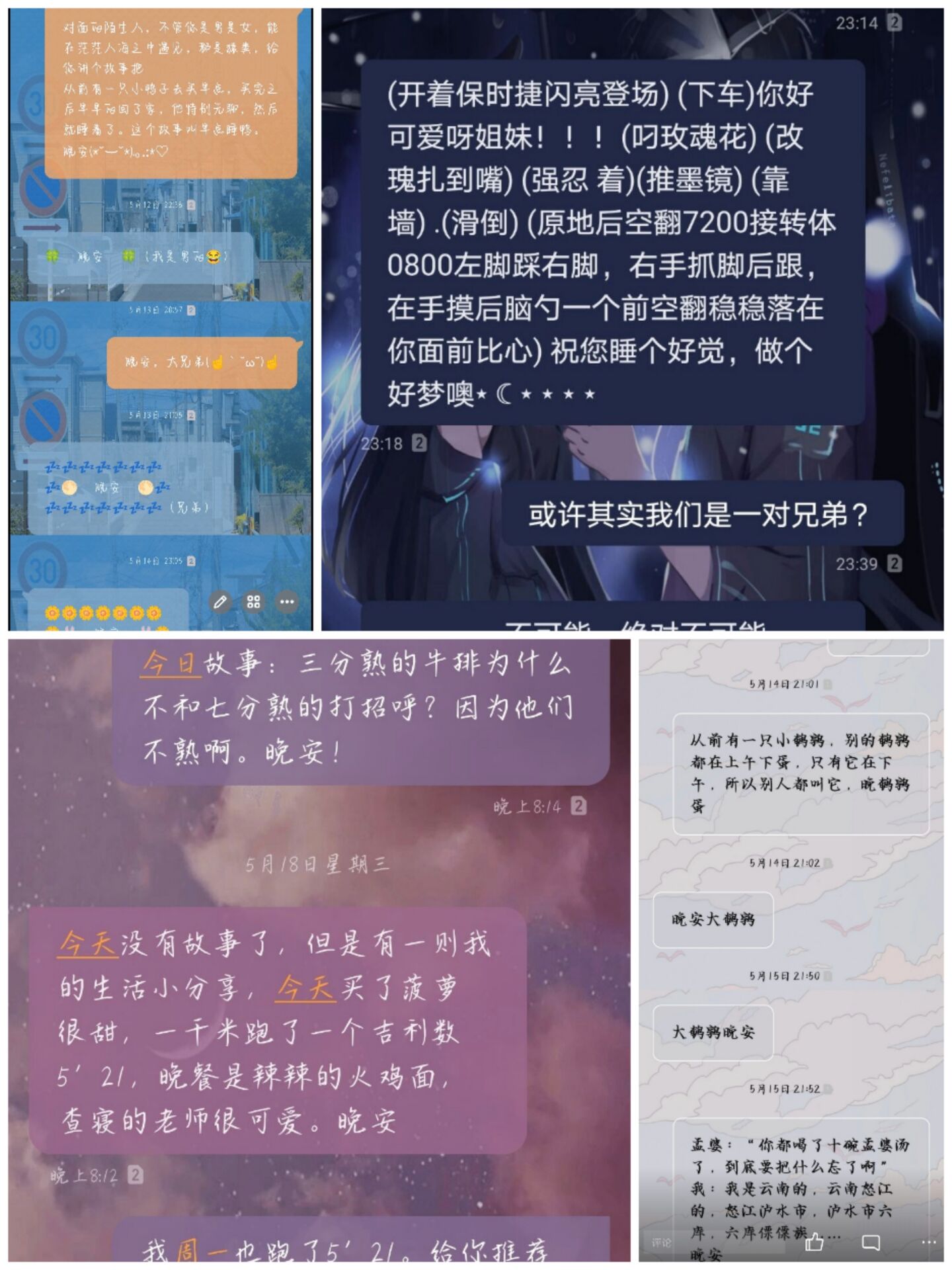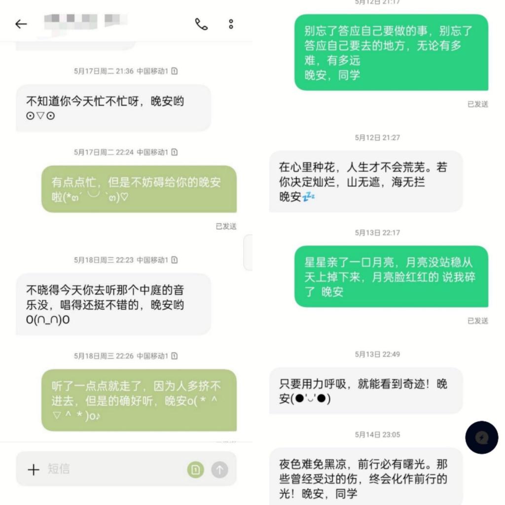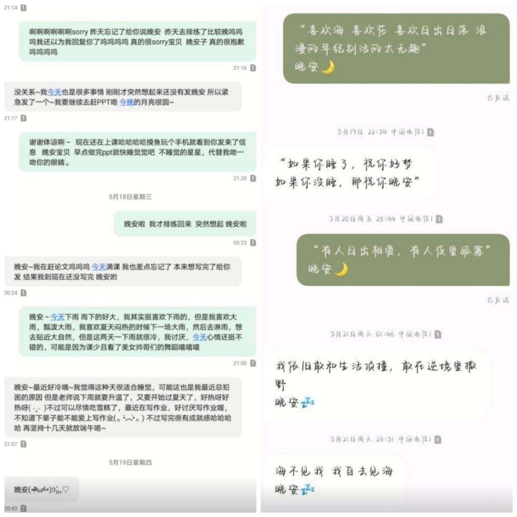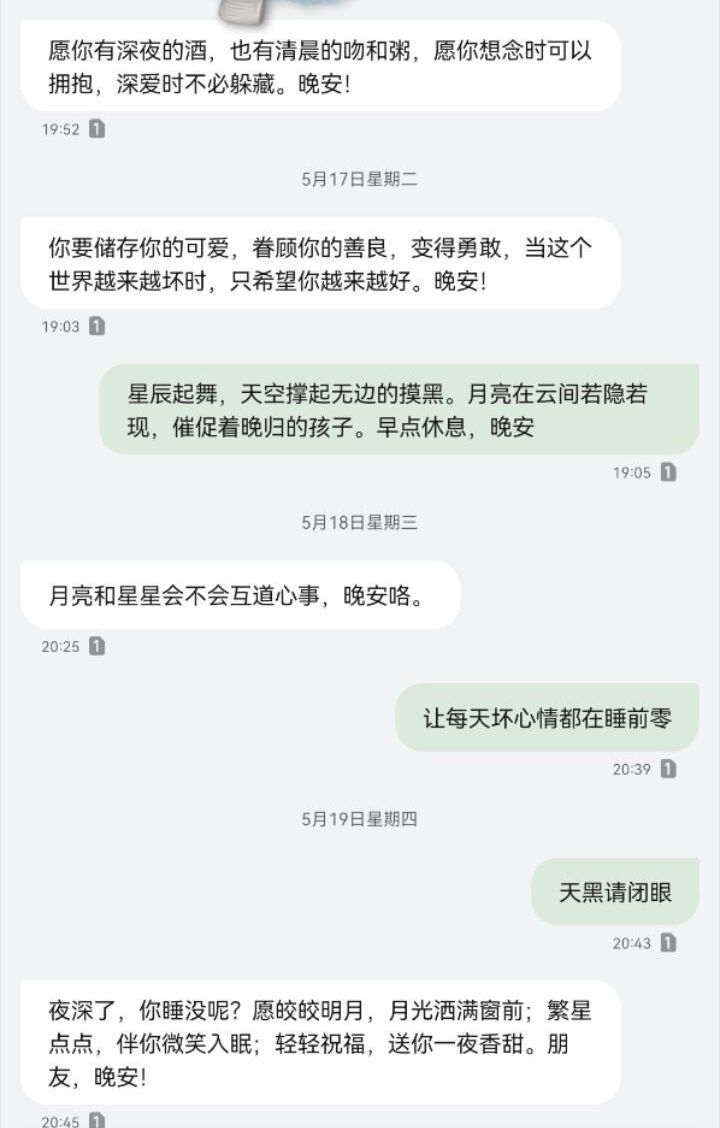 “生活很累,但我们都要成为一把火炬,照亮黑暗,晚安。”每个人的生活生活总是不同的,但忙碌却是永恒不变的主题。当想要放弃的时候,有那么一条消息驱散黑暗出现在你的视野当中,鼓励你继续前进。谭敏同学分享到,有一次她因为一天不愉快的经历而感到难受,又不知如何向朋友倾诉时,她告诉了自己的晚安对象。可让她没想到的是,和她互道晚安的同学却发了长长的一段话过来安慰自己,并且鼓励她不要放弃自己的选择,那一瞬间,她的委屈差点混着眼泪夺眶而出。
