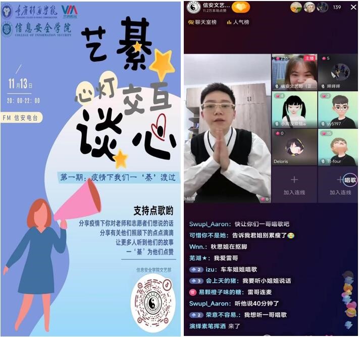 凝心聚力战疫情,冬凉送温稳人心。在特殊时期,全校竭力保障了师生们的生活和学习,同时我们注意到应该关怀大家的心理健康,为缓解疫情期间师生的心理压力,信息安全学院在抖音开启【信安电台,艺“綦”谈心——第一期:疫情下我们一“綦”度过】的直播,为忙碌冲锋的老师及工作人员加油,为在宿舍的同学们投以心灵的慰藉。