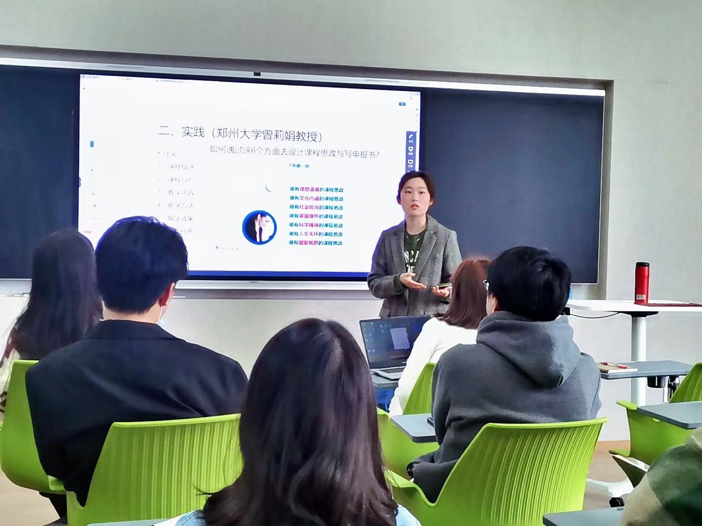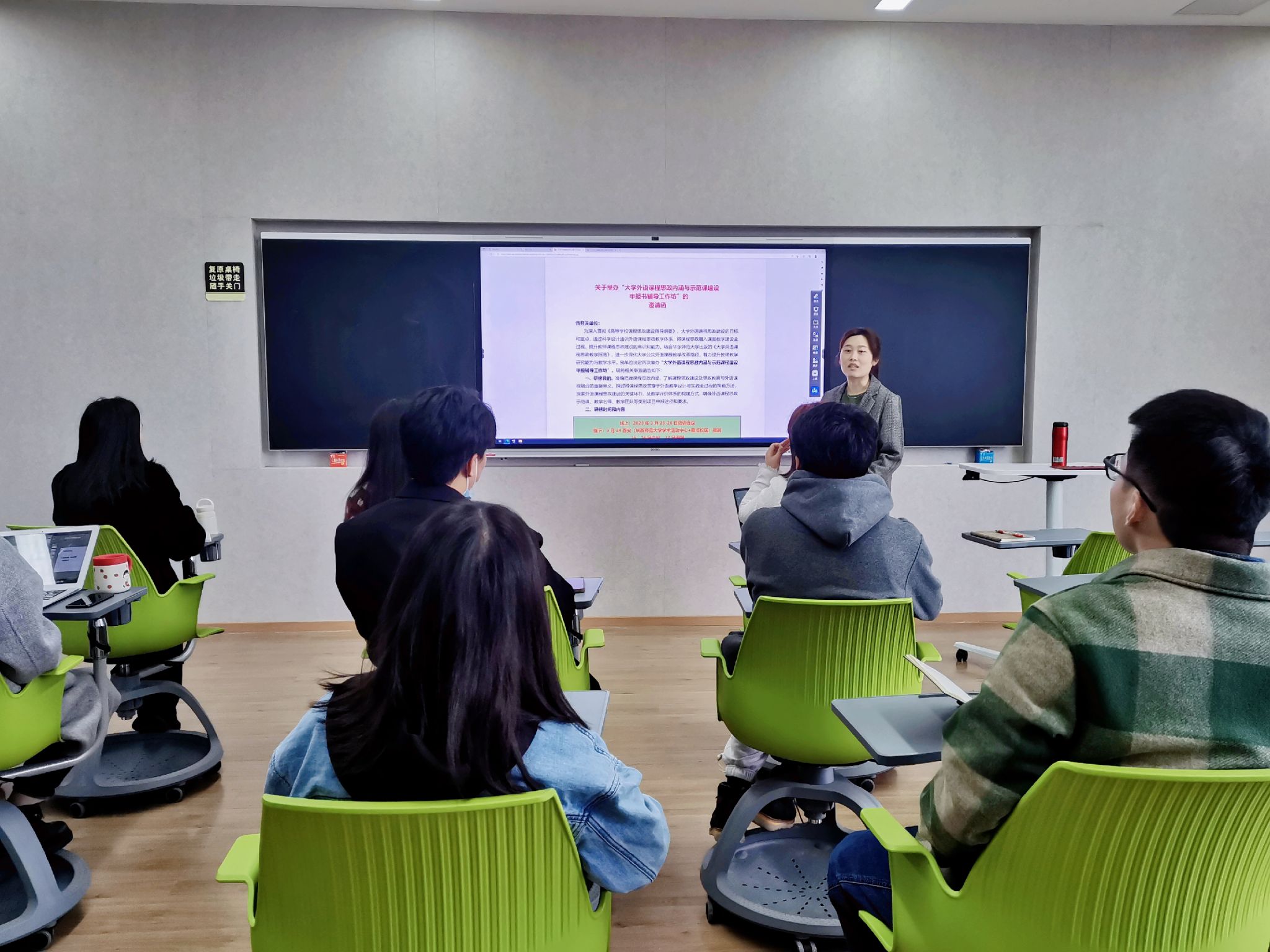 陈彦瑾老师在教师研修分享会中分享了自己参加的“大学外语课程思政内涵与示范课建设”研修会中,曾利娟教授和梅德明教授的主讲内容。她提到,课程思政建设必须有坚实的理论支撑,才能实现广度、深度和高度。接下来,陈彦瑾老师从课程概述、目标、内容、方法、效果和特色六个方面详细阐述了曾教授讲座中关于如何进行课程思政建设的内容。她总结道,通识课教师需要具备丰富的文史哲法政文化知识,并能将学科内容和思政元素紧密融合,才能建设好一门课程。同时,建好一门“金课”的关键之一,在于教师具备超前理念、创新设计和个性突出的课程建设能力。