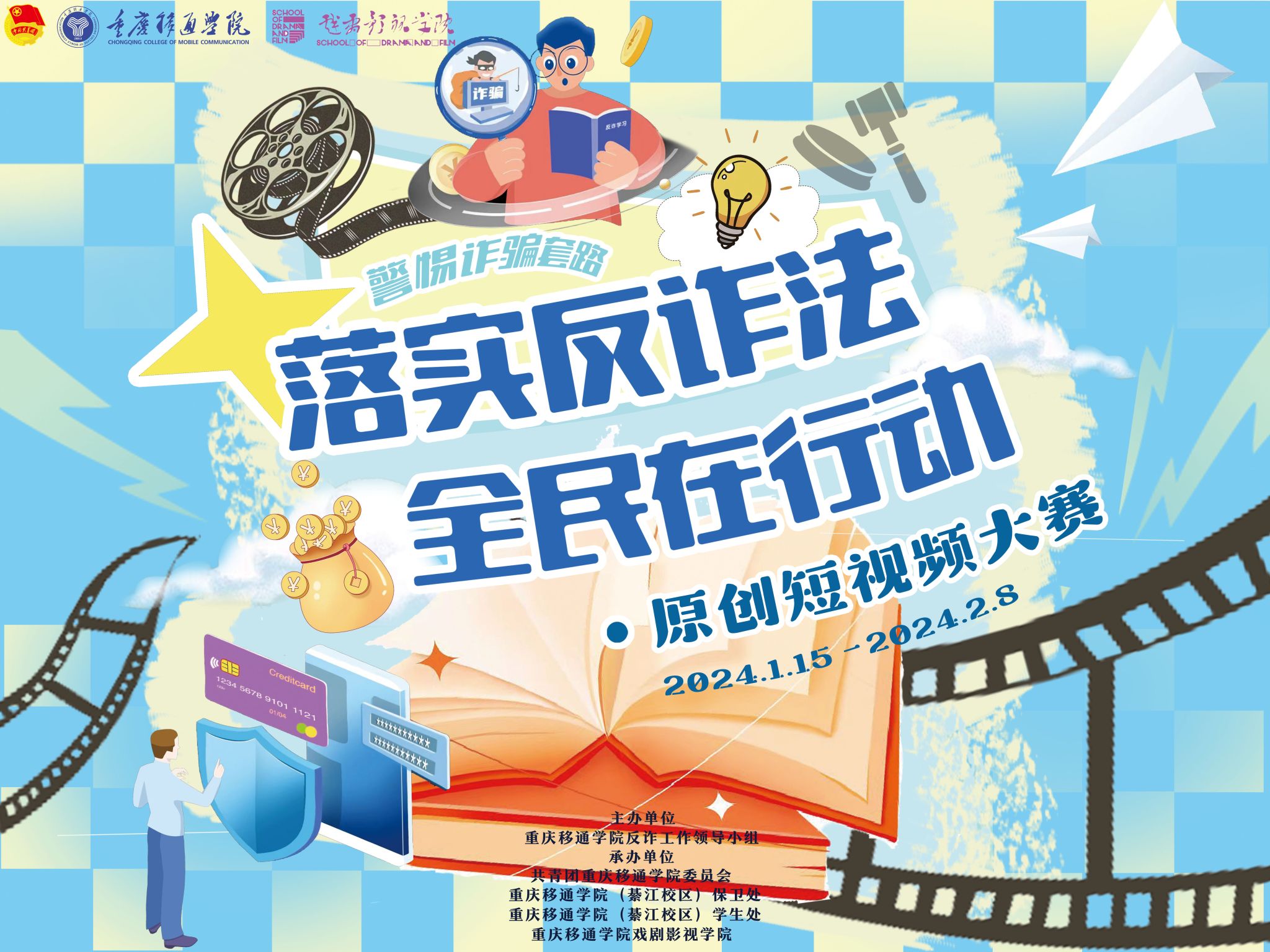 反诈宣传不停歇,防骗意识入人心。为进一步扩大反电信网络诈骗宣传的覆盖面,增强师生防诈意识和识骗能力,防止电信网络诈骗发案反弹。重庆移通学院反诈工作领导小组联合共青团重庆移通学院委员会、綦江校区学生处、綦江校区保卫处、戏剧影视学院于2024年1月15日至2024年3月20日开展了“落实反诈法,全民在行动”原创短视频大赛,切实推进了我校反诈工作开展,营造了和谐稳定的校园环境。