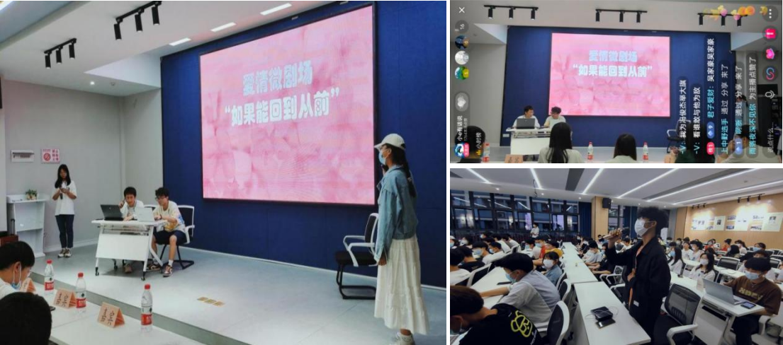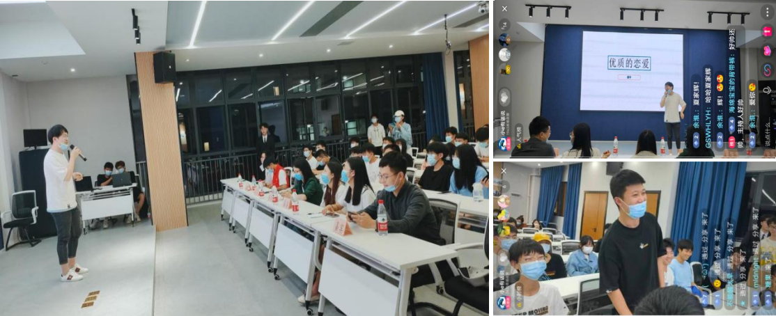蒹葭苍苍,白露为霜,所谓伊人,在水一方。究竟何为爱情?是初见时的《怦然心动》,还是心中《不能说的秘密》,亦或是忘不掉的《那些年,我们一起追的女孩》?一幕幕熟悉的电影画面,一遍遍放映在大屏幕上,一下下敲击着同学们那扇爱情的心门。此时主持人上场,邀请同学们谈谈对于恋爱这件小事的看法。现场的同学争相举手起立发言,线上的同学也积极踊跃发射弹幕,有谈到高中暗恋的女孩已拥有自己的爱情而给予祝福的,有谈到正经历着的甜蜜恋爱脸上不自觉洋溢起幸福笑容的,也有谈到异地恋虽难但愿意迎难而上一起奋斗突破重重困难的,还有谈到即使经历了分手依然对美好爱情充满希望的……