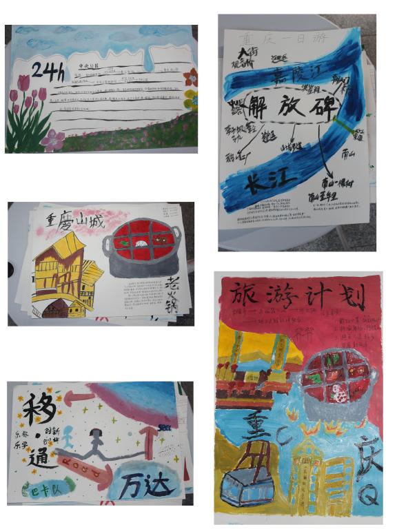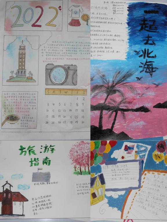 活动以小组为单位,现场商讨制作旅游攻略并完成手抄报绘制,这既给同学们提供了一个同好交流平台,同时营造了理想的合作氛围,还促进了同学之间的交流与沟通。