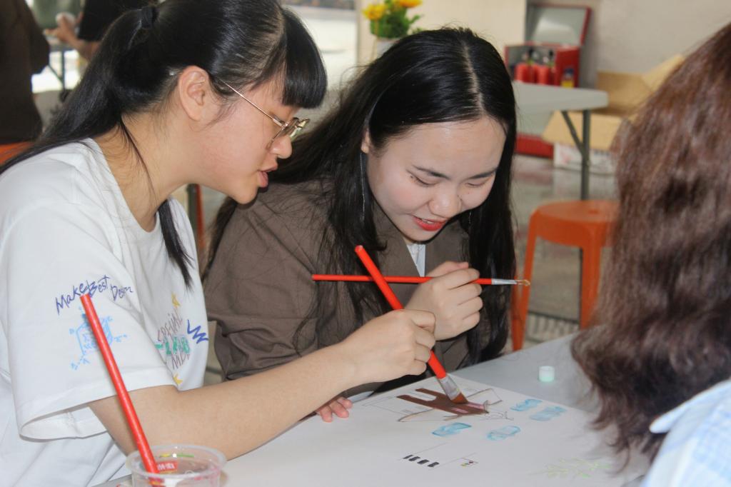 还有一组男女搭配的,看起来似乎是情侣,男生低着头正在画画,女生在帮忙递颜料。“我想带她去我老家看看。我跟她是高三认识的,那时候我成绩很差,连上专科都很费劲,还好有她一直安慰我、鼓励我,我才能顺利考上了移通。上了大学我才敢告白,也还好追到了她。她喜欢桃花,我老家正好有很多桃花,所以一直想带她去看看,什么叫‘人间四月芳菲尽,山寺桃花始盛开’。”