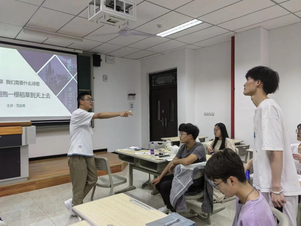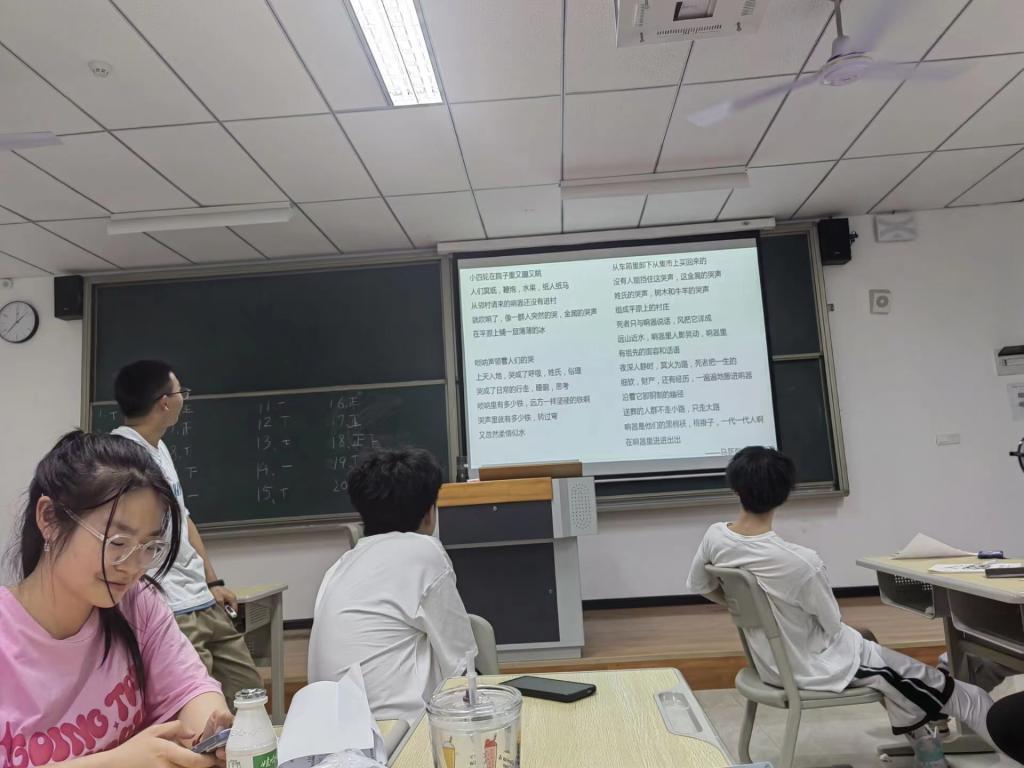 课程最后范老师还讲了上世纪七八十年代的诗歌,他带领我们回到了那个斗志昂扬的时代,那个时候全民文学,诗人们能写,敢写的精神鼓舞着现在的我们。那是一个青年为诗而痴狂的时期,老作家和新生代作家都在努力寻找文学发展的可能性,由此诞生了归来者、与新现实主义诗歌,可以说是中国现代诗发展的一个小高潮。讲述完这些,范老师给我们布置了随堂练笔,以“黑夜里我背负太多无名的罪状”为题,限时写一首诗,这是一个发现灵感,抓住灵感的训练机会,正是因为有了范老师的引导,我们少走了许多的弯路。在诗歌工坊我感受到了无比的温暖,可以通过写诗积蓄细碎的情感,进而爆发出最强劲的力量。