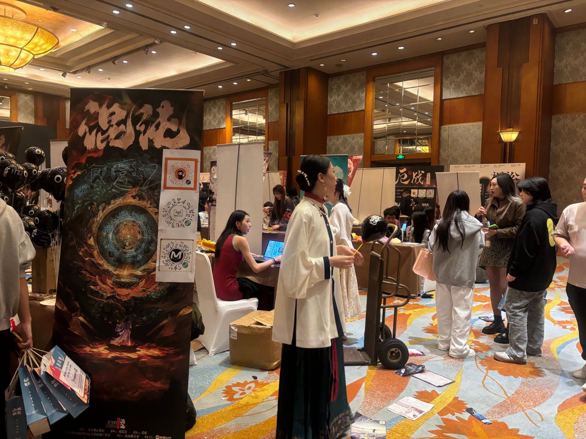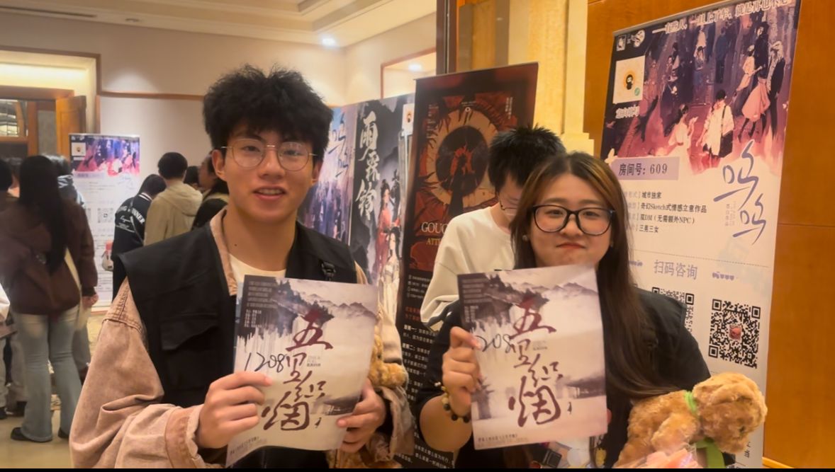 秋风轻拂,签到处弥漫着淡淡的桂花香,展会现场,人头攒动,热闹非凡。同学们带着对剧本杀的喜爱与热情,穿梭于各个展位之间,每一张剧本海报都在诉说着不同的故事,吸引着他们去探索、去体验。在这个充满创意与想象的空间里,同学们与剧本杀从业人员深入探讨,诉说着剧本杀艺术的无限可能。