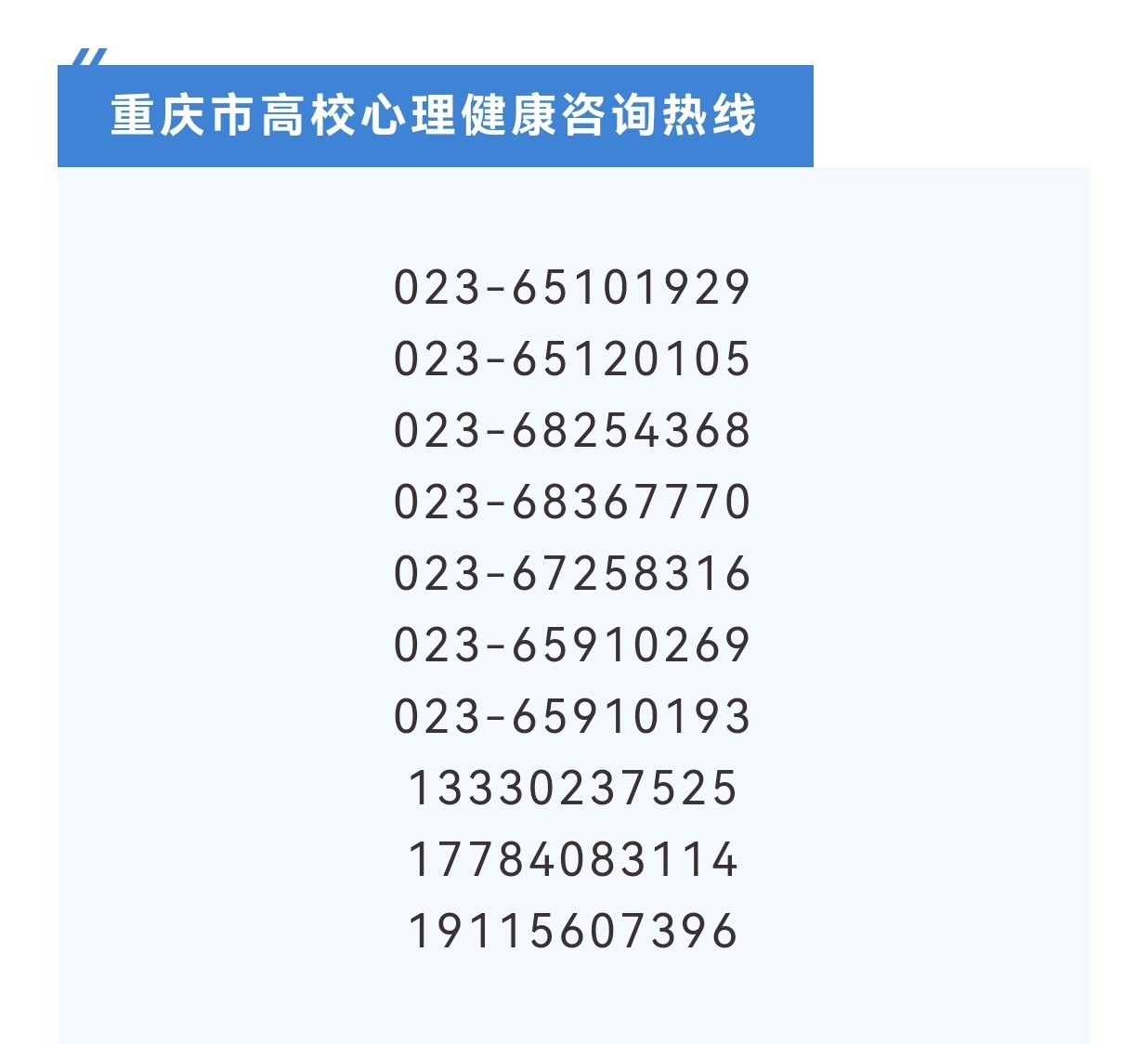 面对种种问题和困惑,也许会让大家产生一些焦虑不安的情绪,就像三毛曾说过:“苦难对我们成了一种功课,一种教育,你好好的利用了这苦难,这就是聪明。”希望广大师生们在校区科学合理的疫情管控下,务必保持积极阳光的心态,一定要相信学校、相信政府、相信国家,“綦”心协力,共克时艰!为了确保广大师生在抗疫期间能够拥有一个健康的心理状态,我们为大家准备了一些攻略,帮助大家进行适当地心理调适,请查收!